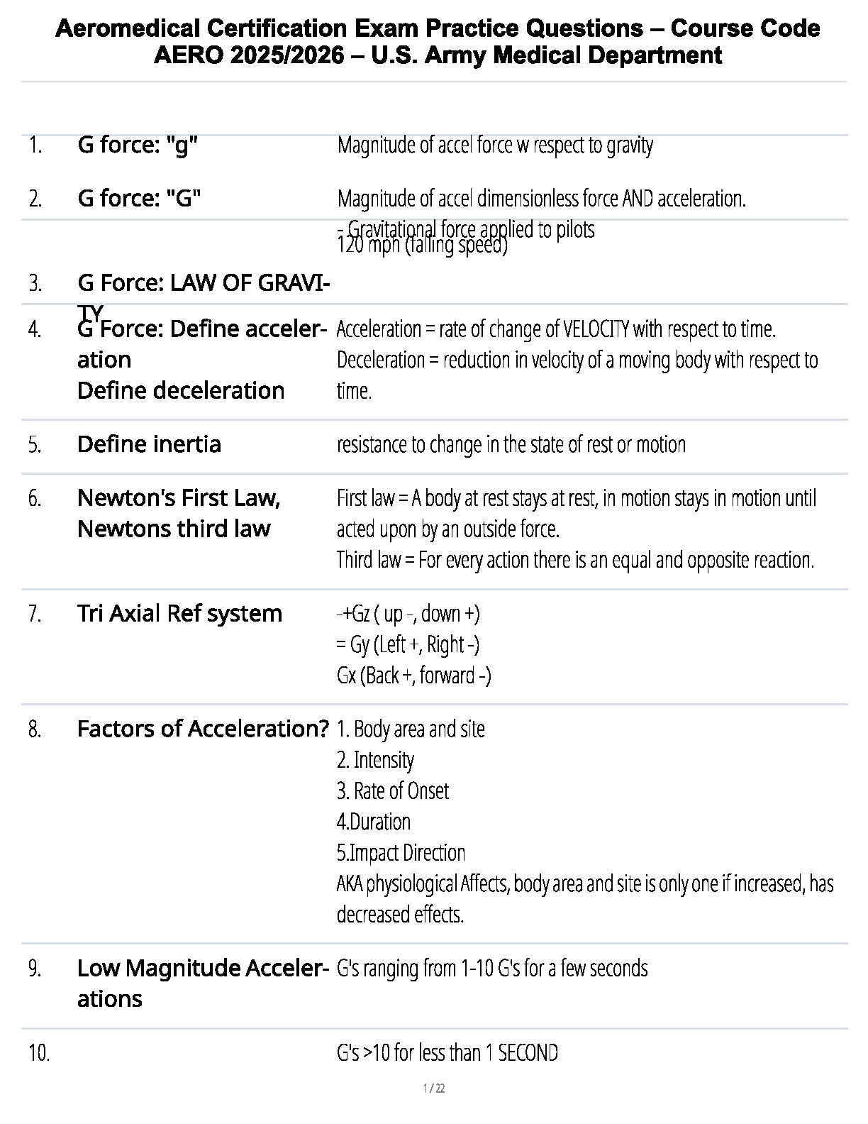 Ace your U.S. Army Aeromedical Certification Exam on your first attempt with this comprehensive and up-to-date study guide for the 2025/2026 AERO course. This meticulously crafted resource provides detailed elaborations and answers to key practice questions, covering essential topics such as G-forces, the laws of gravity and motion (including Newton's Laws), acceleration/deceleration, inertia, and the Tri-Axial Reference system. Designed by experts from the U.S. Army Medical Department, this guide breaks down complex concepts into easy-to-understand definitions, ensuring you have the knowledge and confidence to excel. Stop worrying about resits and secure your certification with the most effective preparation tool available.