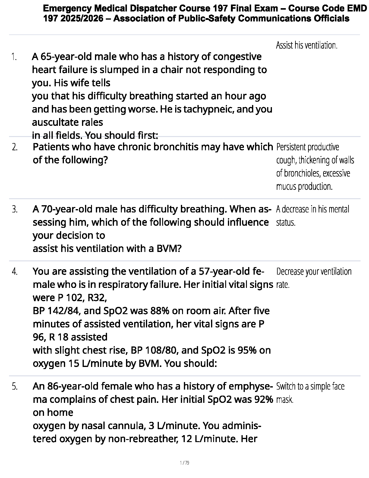 Prepare to ace your certification with the complete Test Bank for the Emergency Medical Dispatcher Course 197 (EMD 197). This newly released 2025/2026 edition, developed in line with the standards of the Association of Public-Safety Communications Officials (APCO International), is your ultimate study tool. This resource features a comprehensive collection of final exam questions, each paired with a verified, correct answer. Spanning 79 pages, it covers a wide range of critical emergency scenarios you'll face as an EMD, from respiratory distress and cardiac emergencies to chronic conditions. Master the material, build your confidence, and ensure you pass the EMD 197 final exam on your first attempt. This is the essential guide to avoid resits and launch your career in public safety communications.