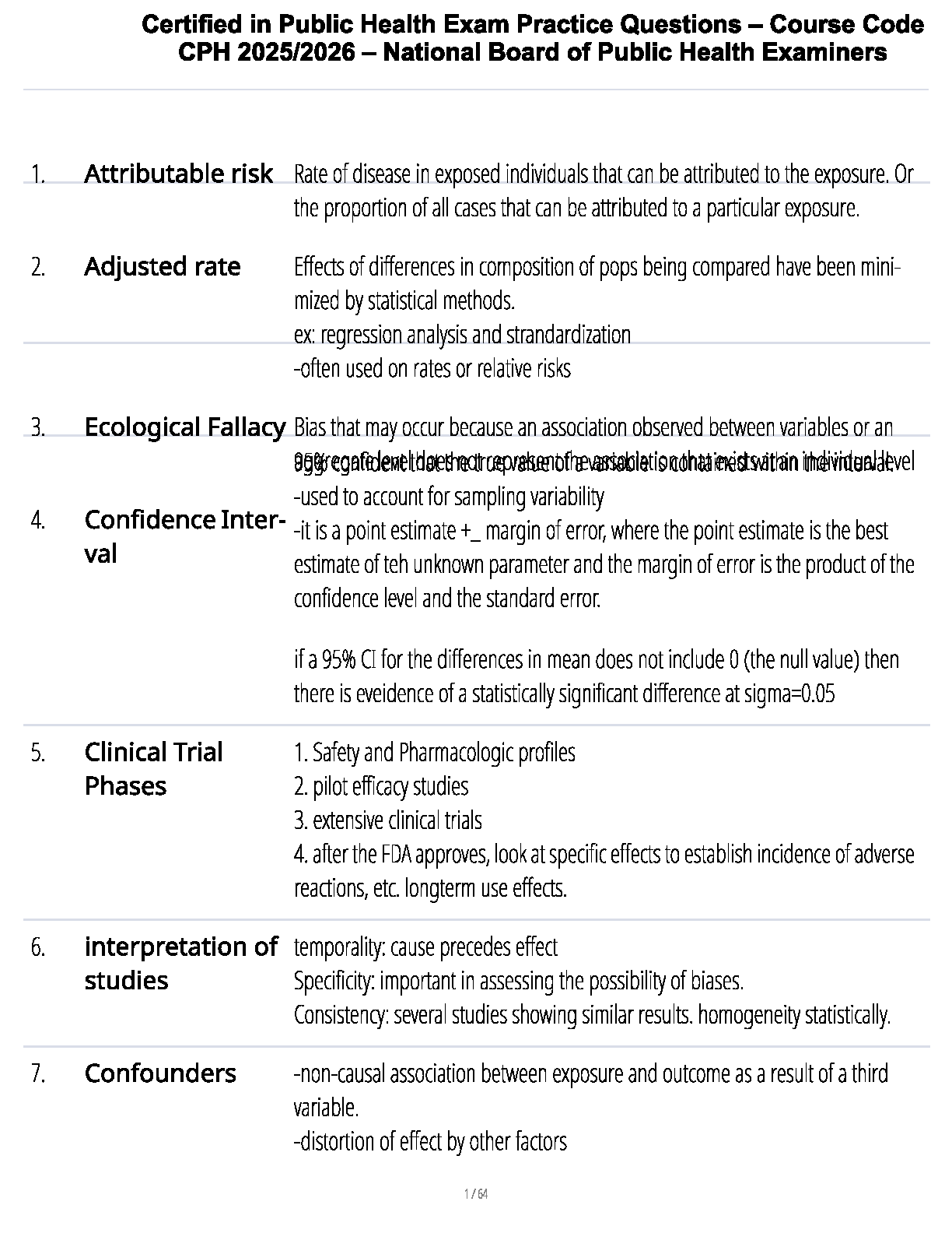Unlock your potential and pass the Certified in Public Health (CPH) exam on your first attempt with our newly updated 2025/2026 study guide. This comprehensive resource provides detailed elaborations on all critical topics outlined by the National Board of Public Health Examiners. Dive deep into key concepts such as attributable risk, ecological fallacy, confidence intervals, clinical trial phases, and study interpretation. Our expertly crafted notes are designed to give you a clear and thorough understanding, moving beyond simple memorization to ensure you can apply your knowledge effectively on exam day. Stop worrying about resits and start your journey to becoming CPH certified with confidence!