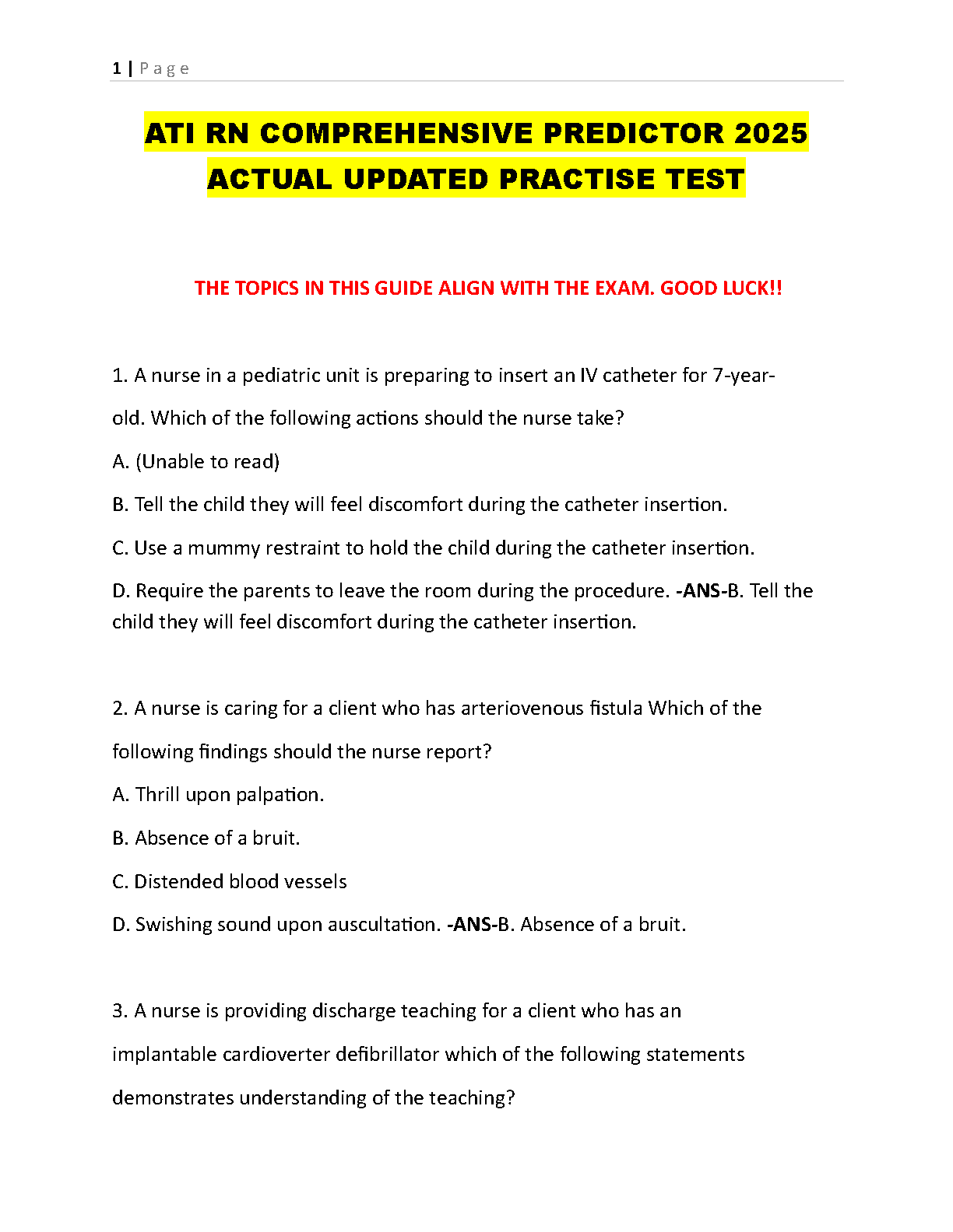 Prepare to excel on your nursing exams with the most current ATI RN Comprehensive Predictor 2025 Test Bank. Developed by ATI Nursing Education, this comprehensive study guide is your key to success. It features a complete collection of updated practice questions, each with a detailed, verified answer. The content is meticulously aligned with the latest 2025 exam curriculum, ensuring you study the most relevant topics. Master complex nursing concepts, boost your confidence, and pass your ATI predictor on the very first try. This is the ultimate resource for nursing students aiming to avoid resits and achieve their best scores.