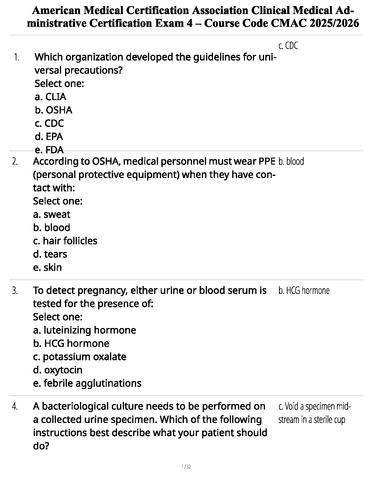 Latest 2025/2026 AMCA CMAC Test Bank | Clinical Medical Administrative Certification Exam 4 (Q&A)