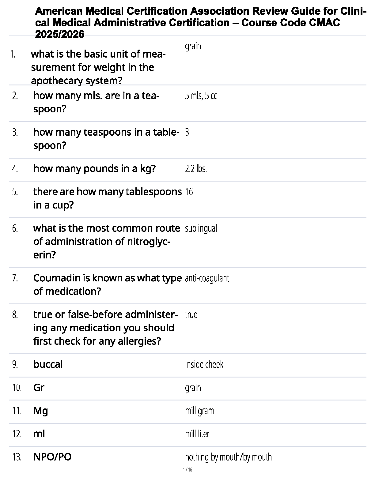 Unlock success in your medical administration career with our latest 2025/2026 review guide for the AMCA Clinical Medical Administrative Certification (CMAC) exam. This comprehensive study resource is structured in an easy-to-follow question-and-answer format, covering all critical topics you'll face on the test, from apothecary measurements and medication administration routes to key medical abbreviations. Meticulously prepared to reflect the current exam syllabus, this guide is your ultimate tool to build confidence, master the material, and pass the CMAC certification on your very first attempt, avoiding costly and time-consuming resits. Get instant access to the essential knowledge needed to excel.