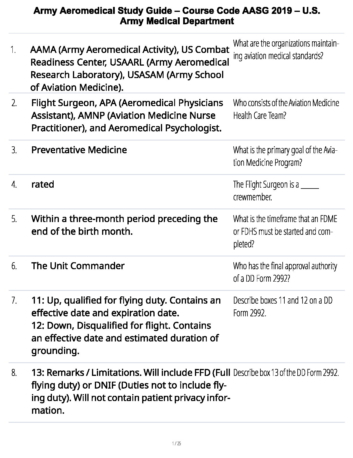 Unlock success in your U.S. Army Aeromedical course with this comprehensive Test Bank for the AASG 2019 edition. Authored by the U.S. Army Medical Department, this study guide is meticulously crafted to help you pass your exams on the first attempt and avoid resits. This essential resource features a detailed question-and-answer format, covering all key topics such as aviation medical standards, the roles of the Flight Surgeon and Aeromedical team, and procedures for DD Form 2992. Get straight to the point with verified answers and master the material needed for your certification. Download now and take the most effective step towards acing your aeromedical training.