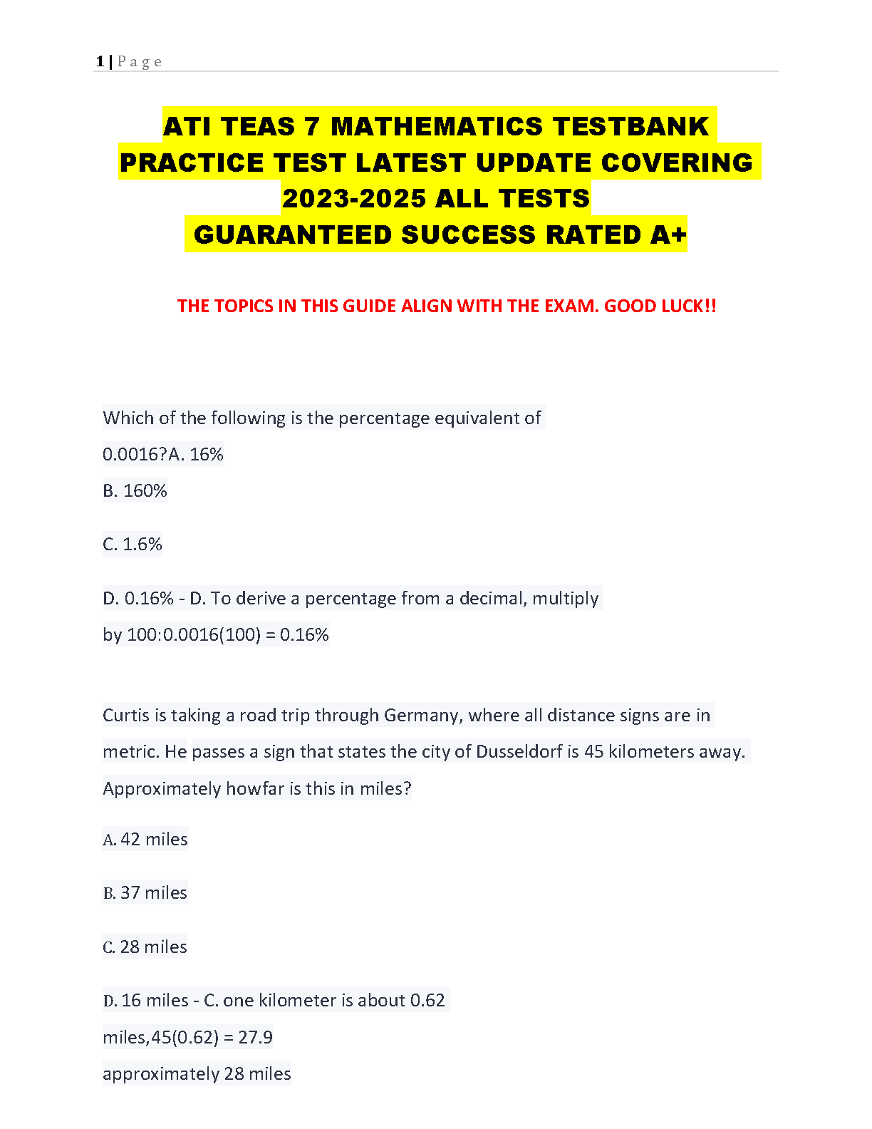 ATI TEAS 7 Mathematics Test Bank by ATI: 2023-2025 Edition with Practice Questions and Verified Answers for A+ Grade Success