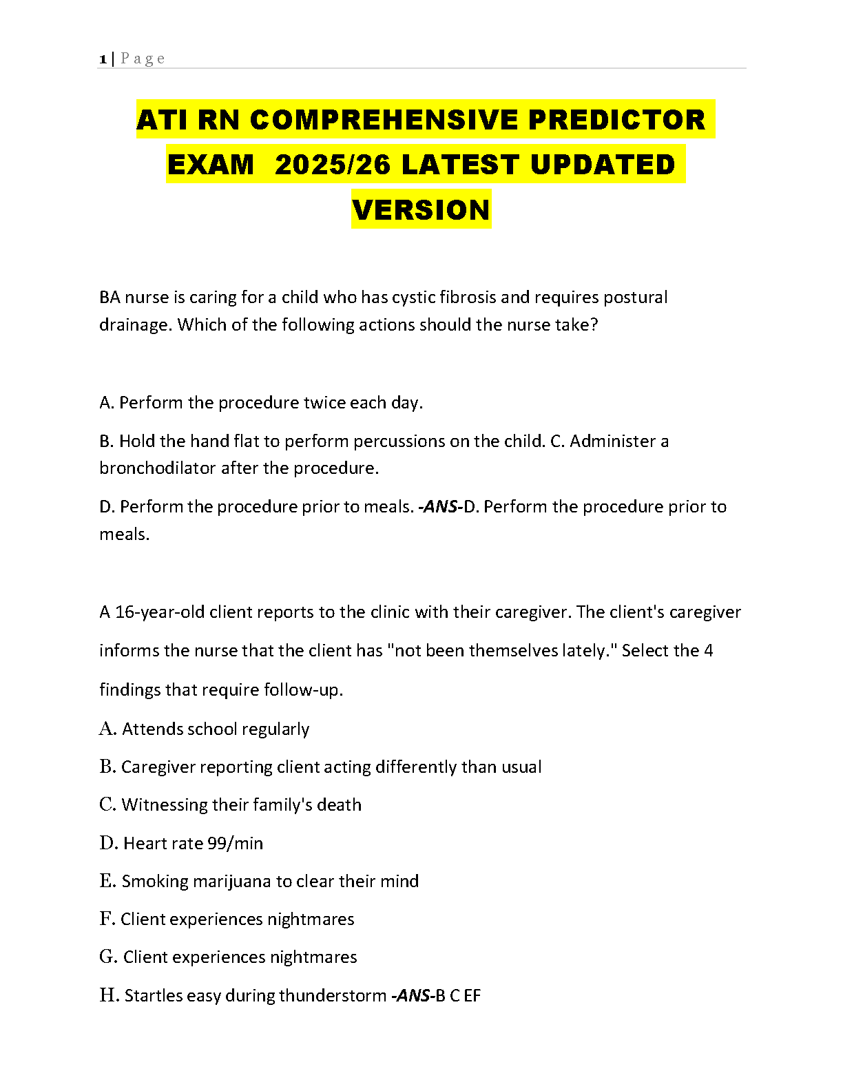 Master the ATI RN Comprehensive Predictor Exam and secure your success on the first try with our latest 2025/2026 edition test bank. This essential study resource is packed with real exam-style questions and detailed, verified answers, covering all critical nursing concepts. It's perfectly designed to boost your confidence, eliminate exam anxiety, and help you pass effortlessly, avoiding the need for costly and stressful resits. Get the ultimate preparation tool trusted by nursing students.