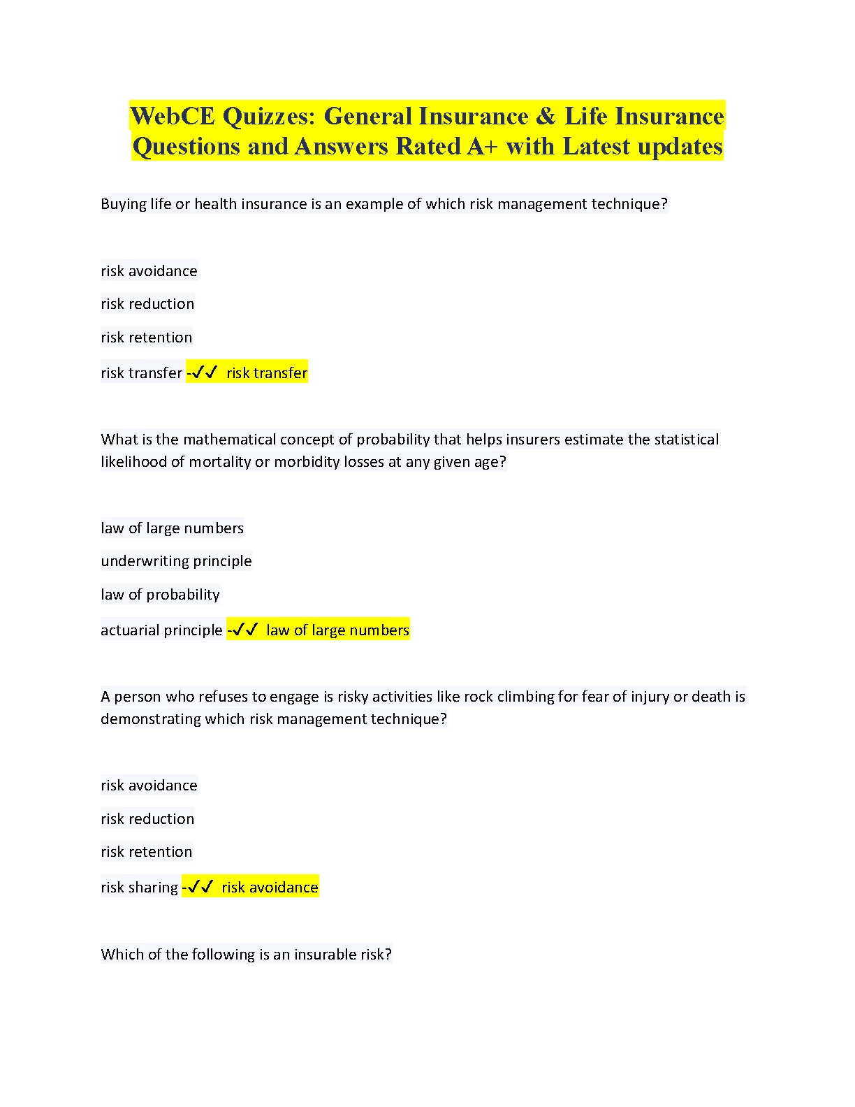 WebCE Quizzes: General Insurance & Life Insurance Questions and Answers. GRADED A+
