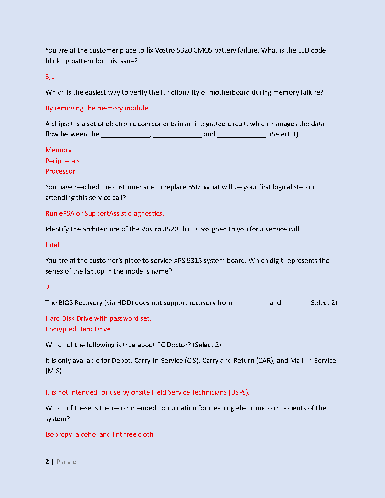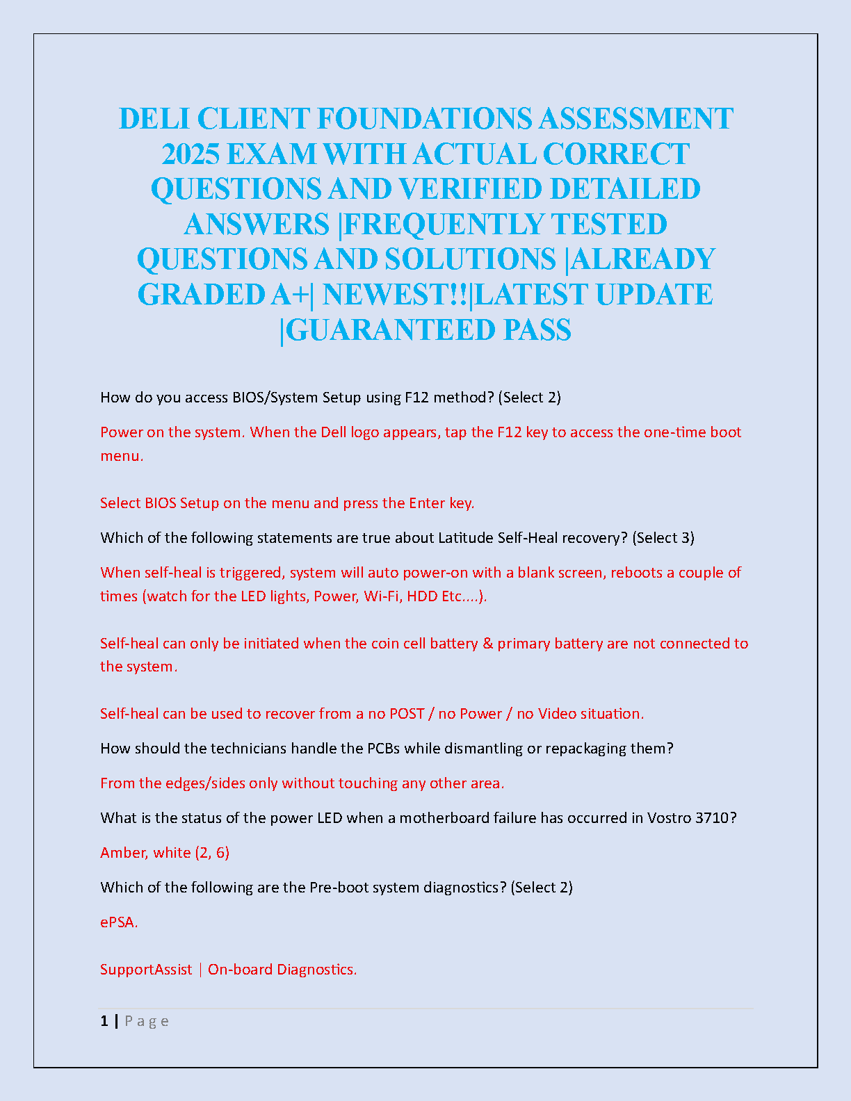 Prepare for your Dell Client Foundations Assessment 2025 certification with our comprehensive test bank. This study guide features a complete collection of verified questions and detailed, accurate answers, covering all essential exam topics. Master key concepts such as BIOS/System Setup, Latitude Self-Heal recovery, PCB handling, motherboard failure diagnostics (Vostro 3710), and pre-boot system diagnostics like ePSA and SupportAssist. Our A+ graded material is the latest update, meticulously designed to ensure you pass your exam with confidence on your first try.