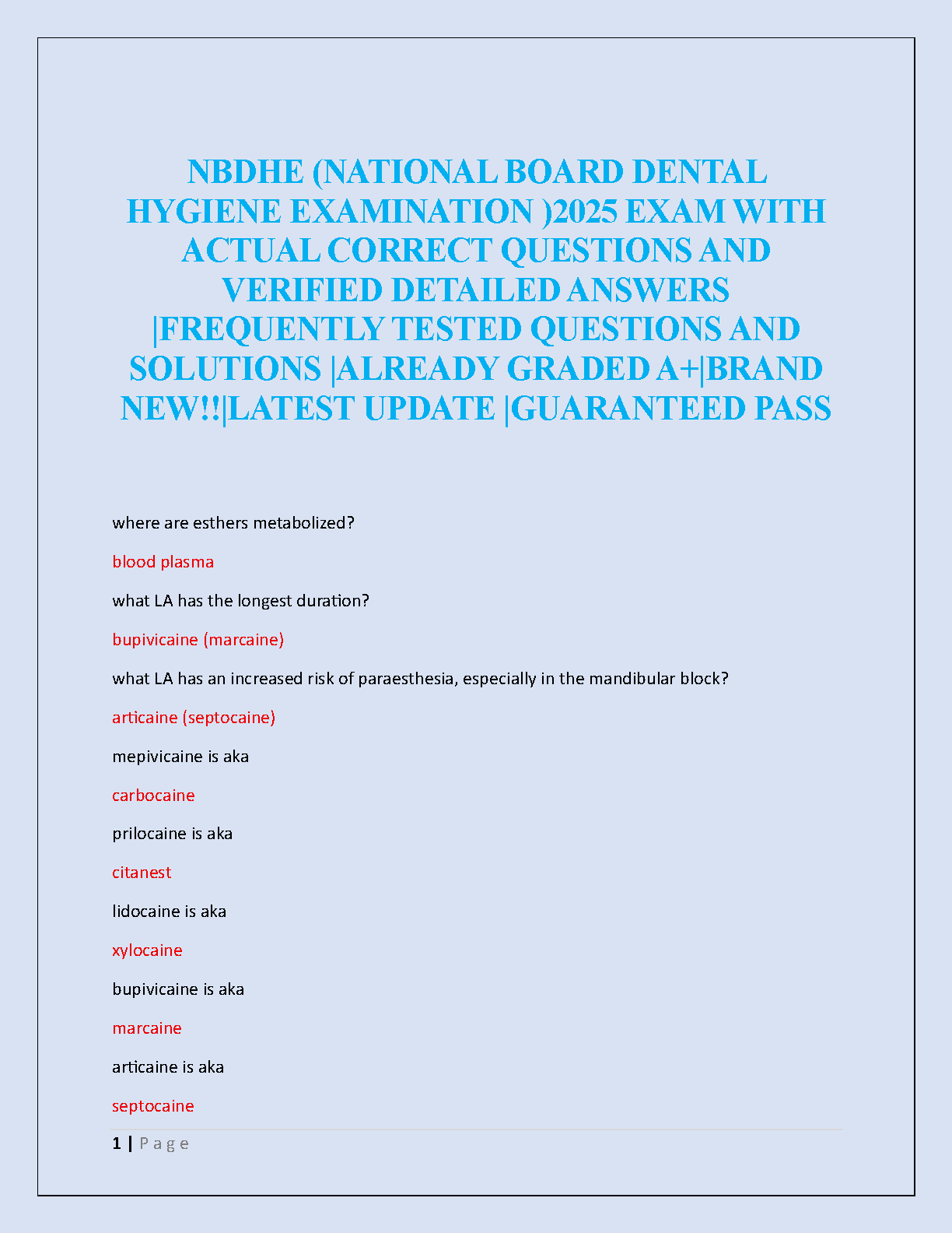 Prepare to excel in your National Board Dental Hygiene Examination (NBDHE) with our brand new, comprehensive test bank for the 2025/2026 academic year. This guide features a meticulously compiled collection of frequently tested questions, each paired with a verified, correct answer and detailed solution. Our resource is already graded A+ and is designed to provide you with the most current and relevant material to ensure you pass the NBDHE on your first attempt. Eliminate exam anxiety and avoid resits by mastering the key concepts covered in this essential study tool. Download now and take the first step towards your certification with confidence!