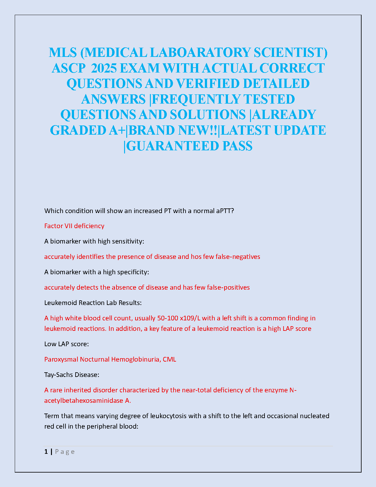 MLS ASCP Medical Laboratory Scientist Test Bank 2025/2026: Master the Exam with A+ Graded Questions & Verified Answers
