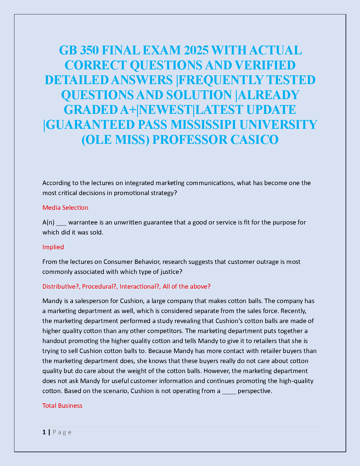Unlock academic success in your Business Communication course with this comprehensive test bank for the GB 350 Final Exam from Mississippi University (Ole Miss), specifically for Professor Casico's class. This essential study guide features a complete collection of frequently tested questions, each paired with a verified, detailed answer and solution. Updated for the latest curriculum, this resource is designed to help you master key concepts, practice with actual exam-style questions, and achieve an A+ grade. Prepare with confidence and guarantee your pass on the first attempt!