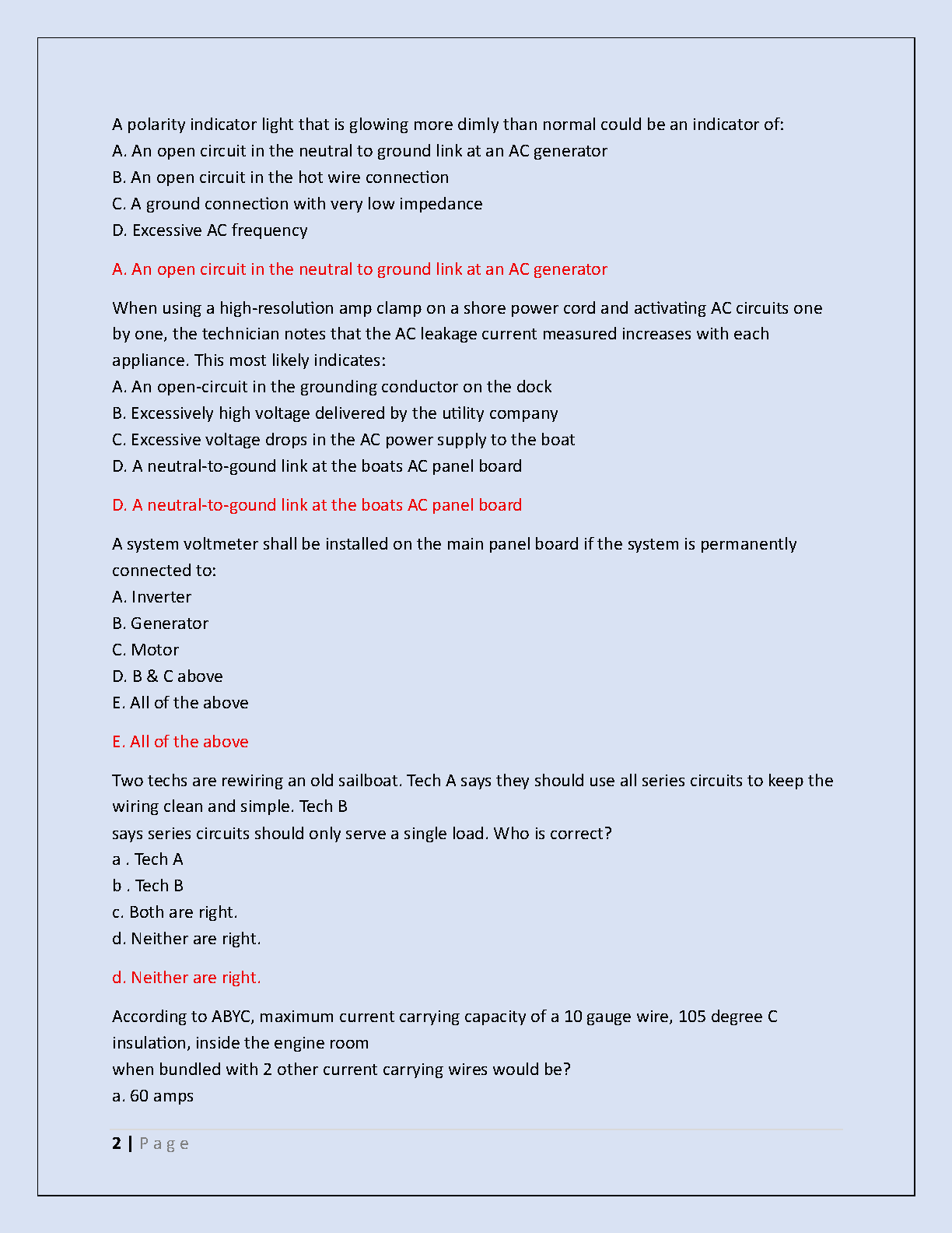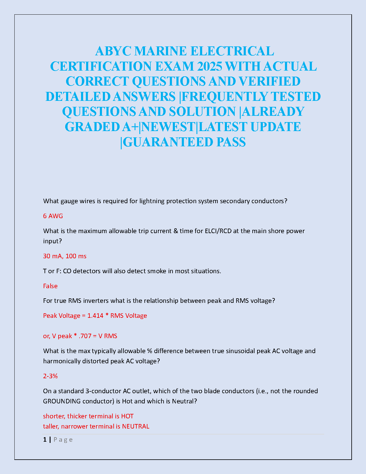 Get ready to ace your ABYC Marine Electrical Certification Exam with our latest 2025/2026 test bank! This comprehensive resource is packed with frequently tested questions and meticulously verified, detailed answers to ensure you have everything you need for success. Our guide is already graded A+ and is specifically designed to help you master the material, avoid resits, and pass on your very first attempt. Download now and confidently prepare for your certification with the most up-to-date and reliable study material available.