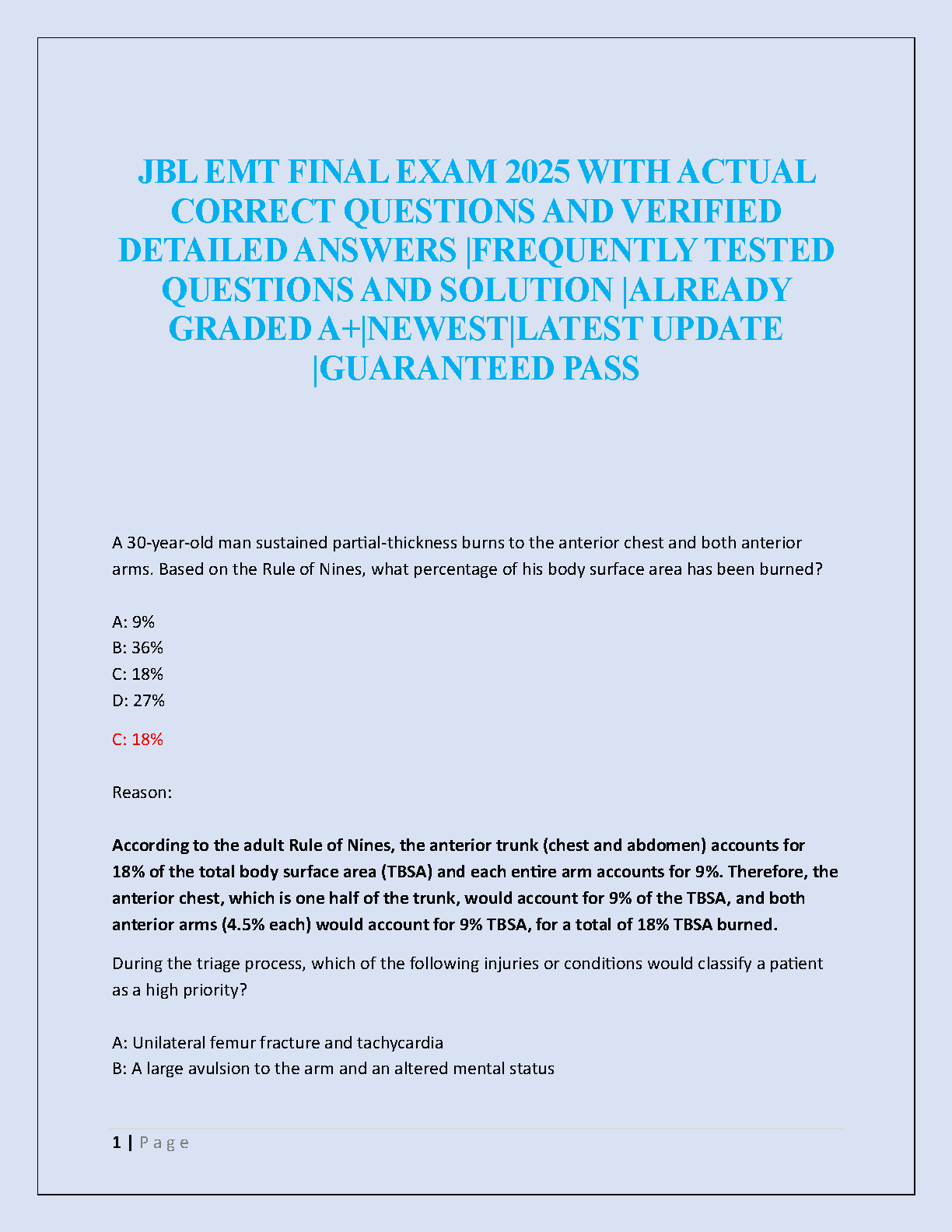 JBL EMT Final Exam Test Bank for Emergency Care and Transportation of the Sick and Injured, 12th Edition by AAOS | Questions and Verified Answers