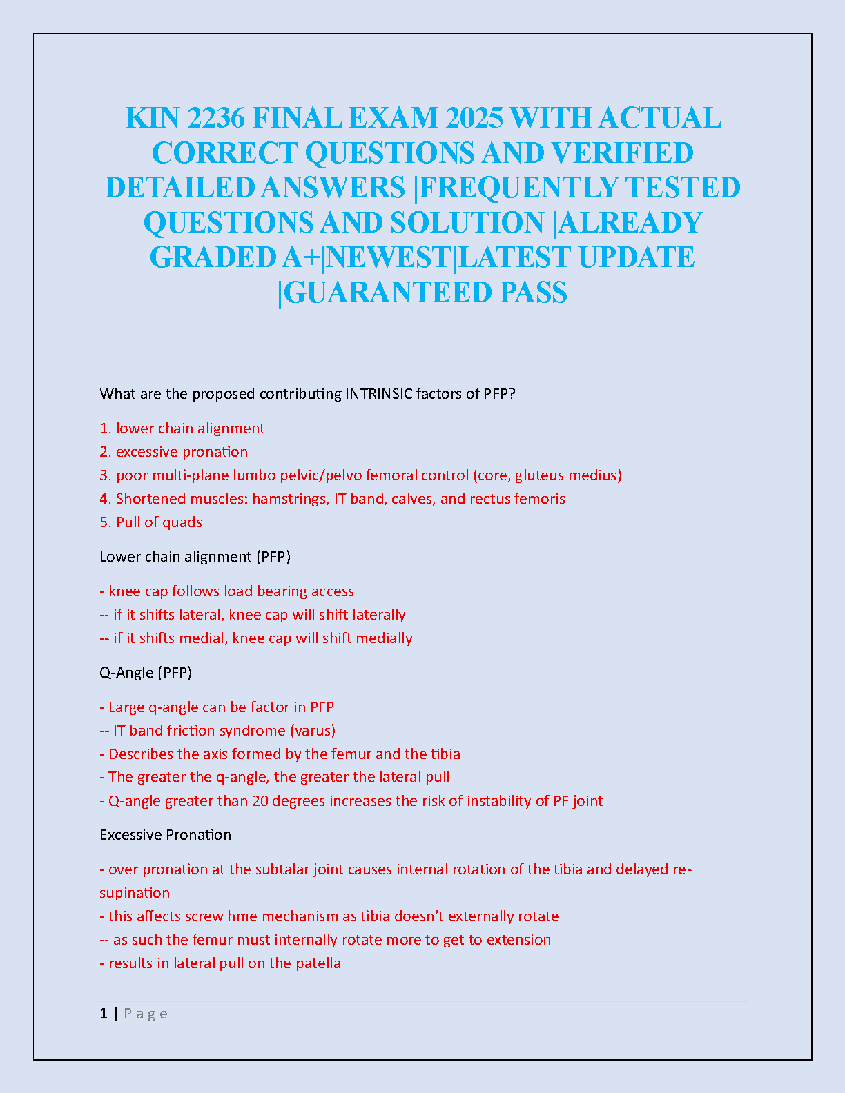 Prepare to ace your KIN 2236 Final Exam with our comprehensive test bank, fully updated for the 2025/2026 academic year. This premium study guide features a complete collection of A+ graded, frequently tested questions and meticulously verified, detailed answers. Master key Kinesiology concepts, from biomechanics to the intrinsic factors of Patellofemoral Pain (PFP), and walk into your exam with total confidence. This resource is expertly designed to help you pass on your first attempt and avoid resits. Download today and secure your A!