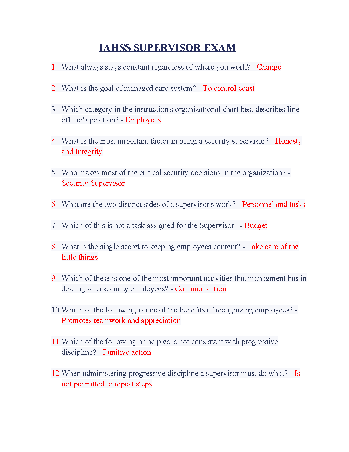 IAHSS SUPERVISOR EXAM. QUESTIONS WITH 100% VEIFIED ANSWERS 2023/2024. GUARANTEED PASS
