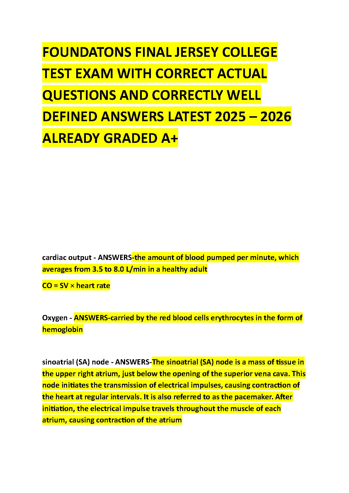 Unlock success in your nursing studies with the ultimate study resource for the Jersey College Foundations Final Exam. This comprehensive test bank, fully updated for the 2025-2026 academic year, is your key to acing the course. It features a complete set of actual exam questions paired with correctly defined, A+ graded answers, covering critical topics such as cardiac output, oxygen transport, and the sinoatrial (SA) node. Stop worrying about resits and start studying with confidence. This guide is expertly designed to help you master the material and pass your final exam on the first attempt. Download now and secure your A+!