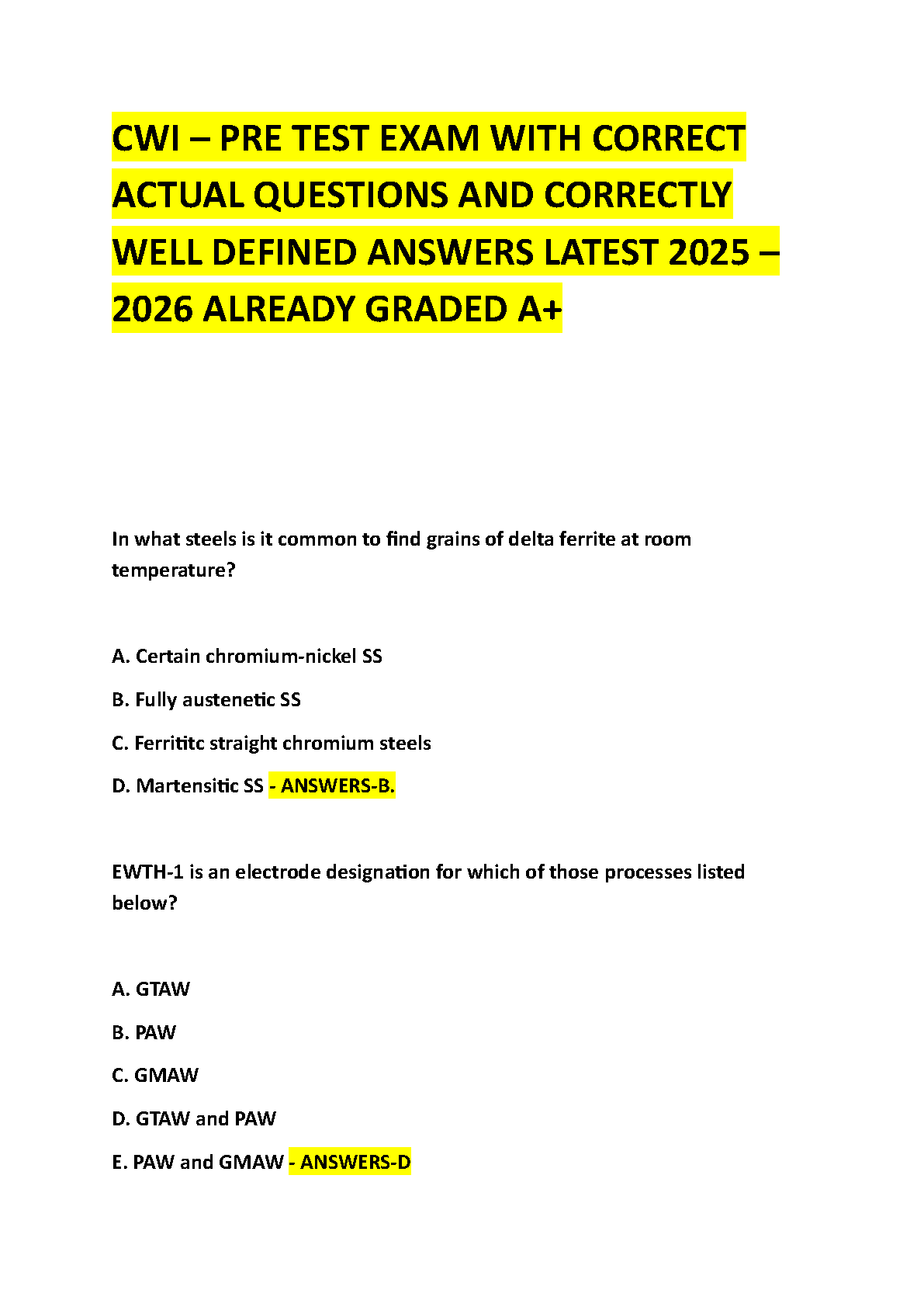 Get ready to ace your Certified Welding Inspector exam on the first attempt! Our latest 2025-2026 CWI Test Bank is your ultimate study partner. This comprehensive guide is packed with actual exam questions and meticulously verified, A+ graded answers. By focusing on real test scenarios, you'll master critical welding inspection concepts, from metallurgy to electrode designations. Stop worrying about resits and start preparing for success. Download now to gain the confidence and knowledge needed to earn your CWI certification.