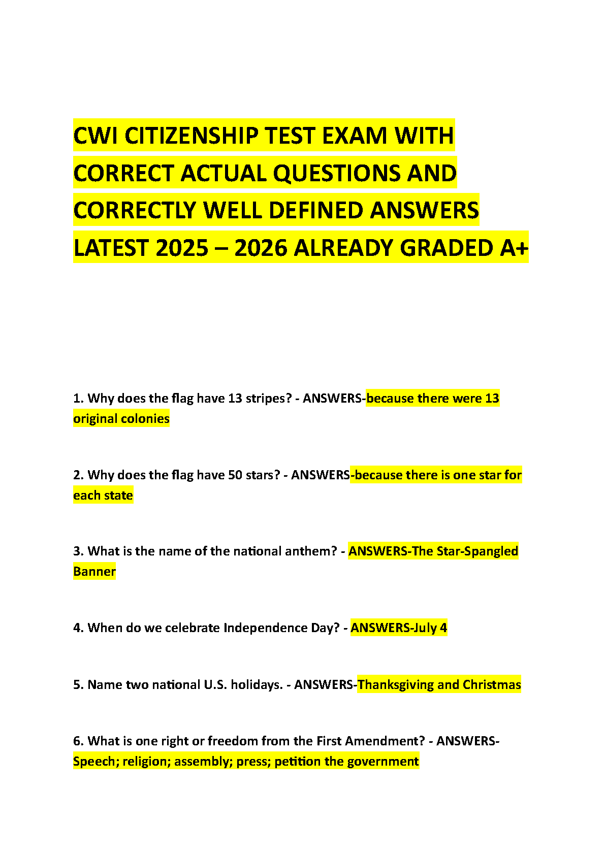 Prepare to ace your CWI Citizenship Test with our latest 2025-2026 study guide. This test bank features a complete set of actual exam questions, each paired with a clear, correct, and well-defined answer. Already graded A+, this resource is your ultimate tool for success. Master key topics in U.S. civics, history, and government and walk into your naturalization test with confidence. Secure your A+ and pass on the first try with these verified materials.