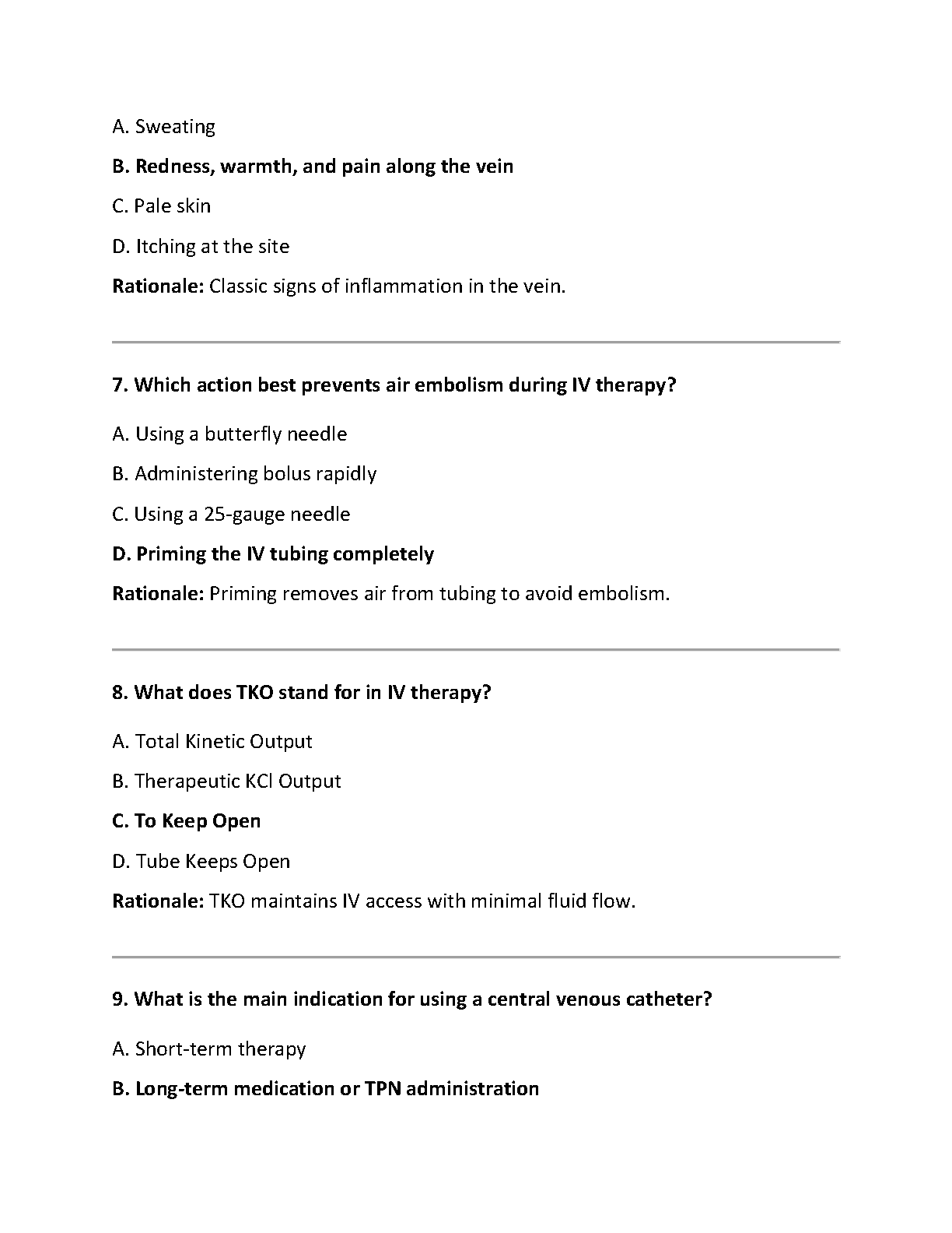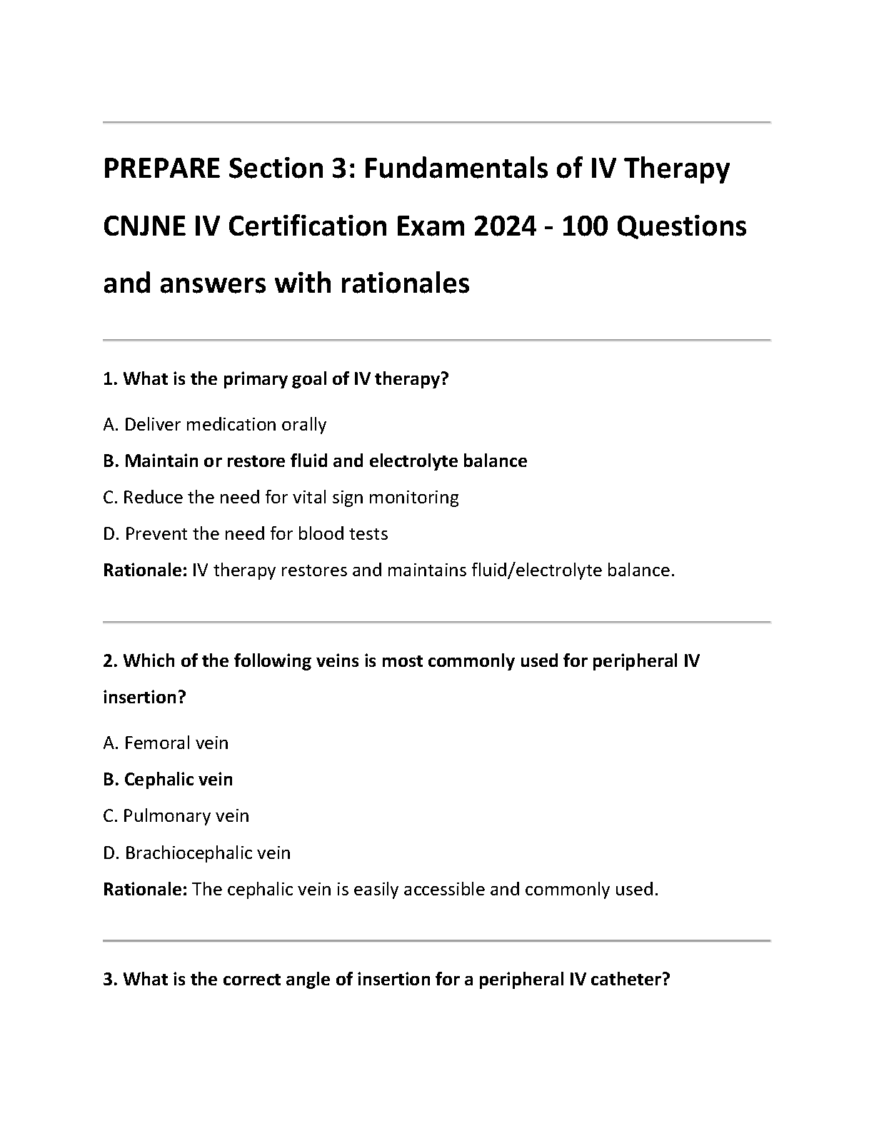 Ace your 2024 CNJNE IV Certification Exam with our comprehensive test bank! This essential study guide features 100 practice questions, complete with correct answers and detailed rationales, focusing on the Fundamentals of IV Therapy. Master key concepts such as fluid and electrolyte balance, vein selection, and proper insertion techniques. This resource is expertly designed to boost your confidence and help you pass your certification on the very first try.
