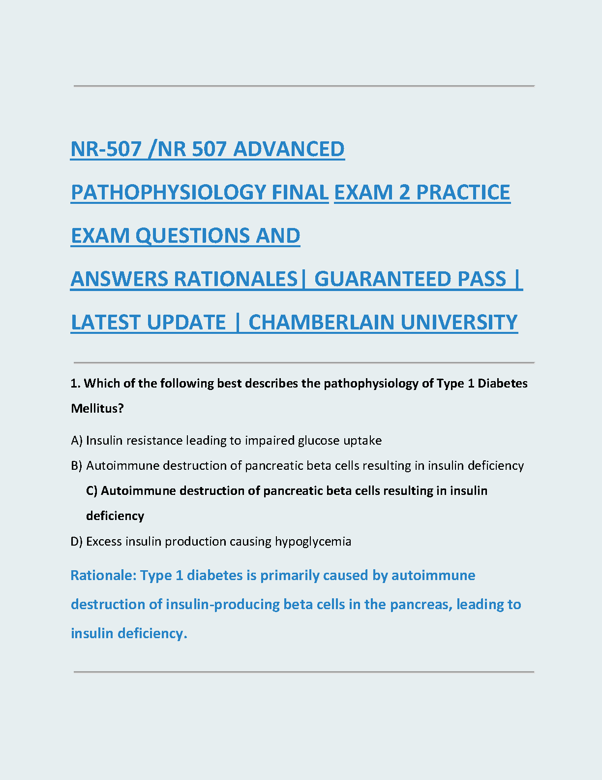 Excel in your NR 507 Advanced Pathophysiology course at Chamberlain University with this comprehensive study guide for the Final Exam 2. This latest 2025/2026 resource is specifically designed to help you pass on your first attempt. It features an extensive bank of practice questions, each with a correct answer and a detailed rationale to deepen your understanding of complex pathophysiological concepts. Stop stressing about resits and confidently master the material needed to ace your exam. Download now for a guaranteed path to success!
