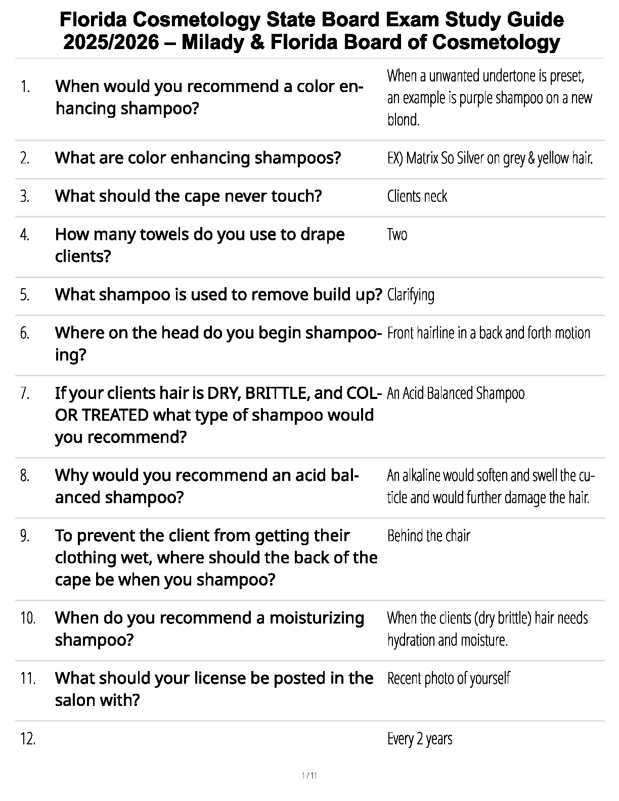 Ace your Florida Cosmetology State Board Exam with our comprehensive 2025/2026 study guide! This resource, meticulously compiled from the latest Milady curriculum and aligned with the Florida Board of Cosmetology requirements, provides detailed questions and direct answers to all the essential topics you'll face. From hair care techniques to salon safety and licensing rules, this guide is your ultimate tool for success. Prepare effectively, build your confidence, and pass your exam on the very first try, avoiding costly and stressful resits. Get instant access to the knowledge you need to launch your cosmetology career!