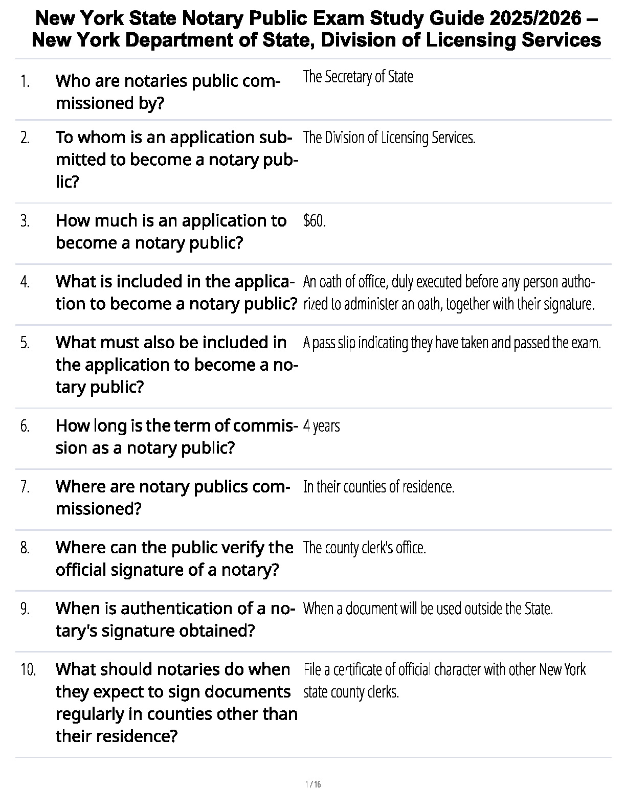 Ace your New York State Notary Public Exam on the first try with our comprehensive 2025/2026 Test Bank and Study Guide. This resource, crafted from the official materials by the New York Department of State, Division of Licensing Services, is your ultimate tool for success. It features a detailed list of potential exam questions with their correct answers, covering all essential topics from application procedures and fees to the duties and legal responsibilities of a notary. The straightforward Q&A format simplifies complex information, allowing you to study efficiently and master the material needed to pass with confidence. Get the latest, most accurate preparation available and begin your career as a NYS Notary Public without the stress of retakes.