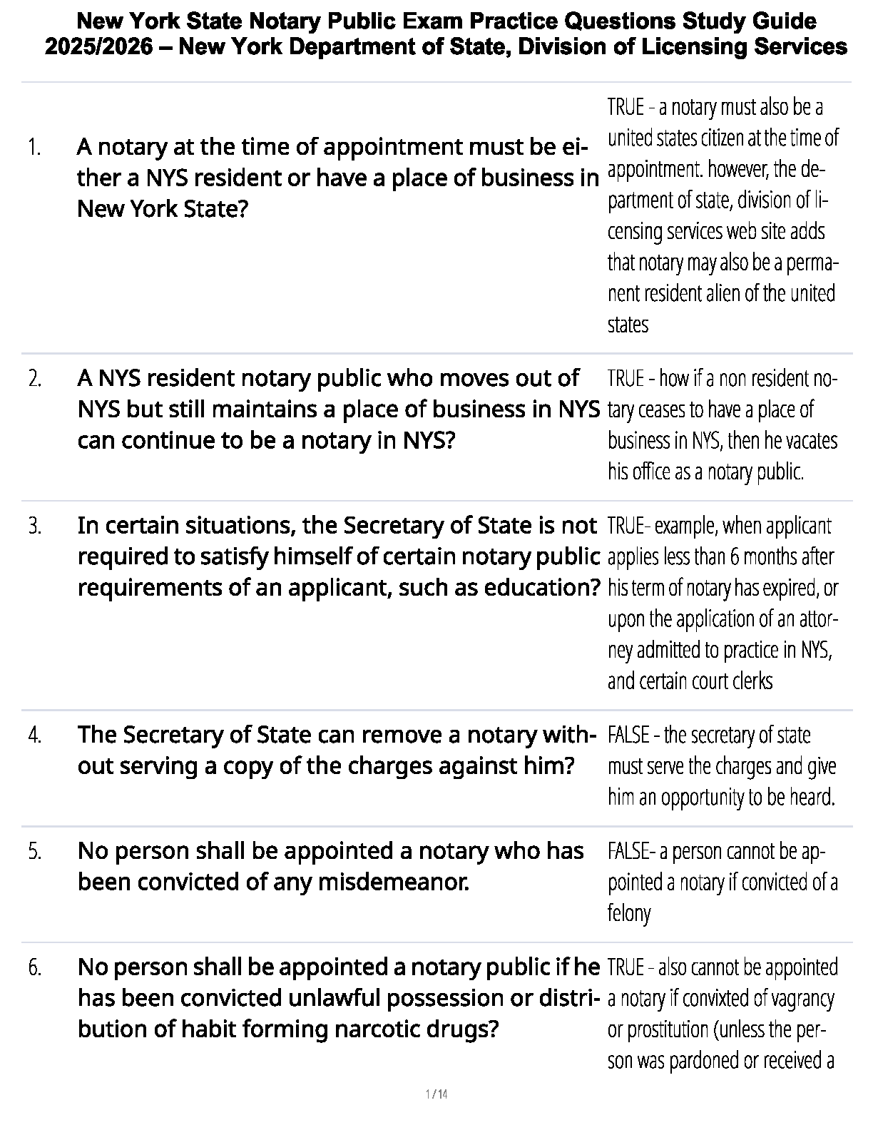 Unlock your potential and become a New York State Notary Public with confidence! This is the latest and most comprehensive Test Bank and Study Guide for the 2025/2026 NYS Notary Public Exam, sourced directly from the New York Department of State, Division of Licensing Services. This essential resource features a wide range of practice questions, complete with detailed true/false answers and clear explanations, covering all the critical topics you'll face on test day. Designed to help you master the material efficiently, this guide is your key to passing the exam on your very first attempt, saving you time and the stress of a resit. Prepare smart, not hard, and start your notary career in New York!