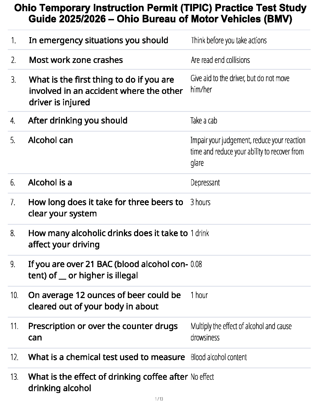 Get ready to hit the road with confidence! This comprehensive study guide for the Ohio Temporary Instruction Permit (TIPIC) test is fully updated for the 2025/2026 testing season. Created by the Ohio Bureau of Motor Vehicles (BMV), this resource is packed with essential practice questions and clear, concise answers covering everything you need to know to pass your permit exam on the very first attempt. Master crucial topics like traffic laws, emergency procedures, and the rules of the road. Avoid the stress of a resit and start your driving journey successfully with this must-have guide.