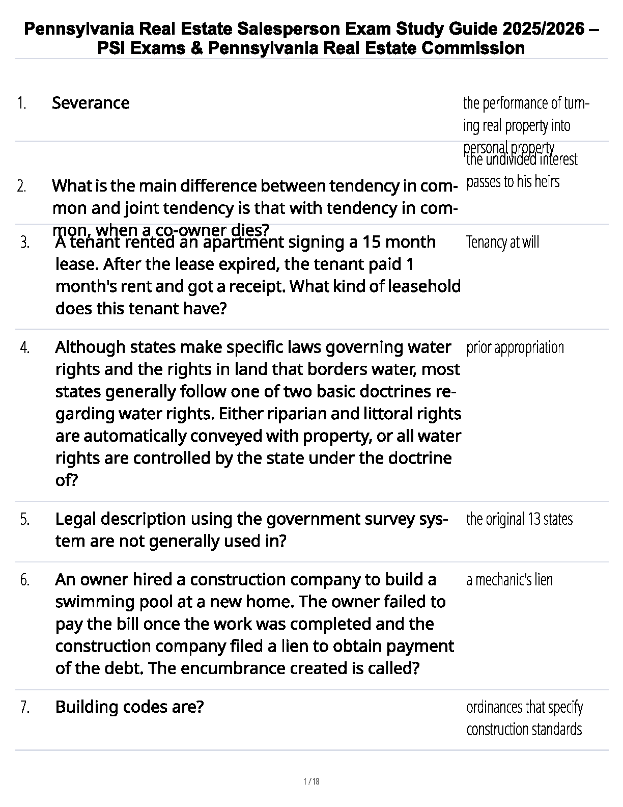 Prepare to pass the Pennsylvania Real Estate Salesperson Exam with confidence using our comprehensive 2025/2026 study guide and test bank. This resource is specifically designed for the PSI exam and covers all essential topics you need to know. Inside, you'll find a detailed collection of practice questions and verified answers on key subjects such as property ownership, tenancy, water rights, encumbrances like mechanic's liens, building codes, and much more. This up-to-date guide is your essential tool to master the material, avoid costly resits, and launch your real estate career in Pennsylvania. Get the edge you need to succeed on your first try!