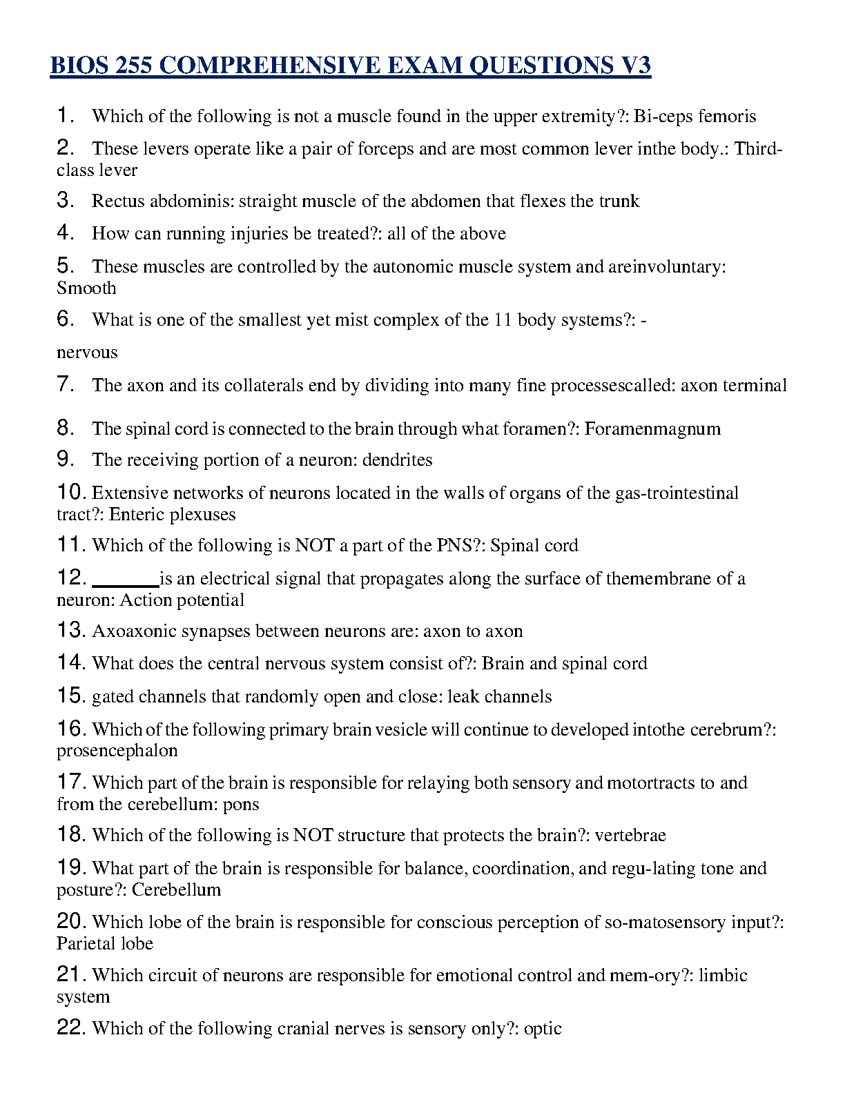 Ace your BIOS 255 Anatomy and Physiology final exam with our comprehensive test bank! This resource, tailored for students using Tortora and Derrickson's 'Principles of Anatomy and Physiology, 16th Edition,' features the complete 'Comprehensive Exam Questions V3' collection. Dive deep into verified questions and answers covering crucial topics such as the central and peripheral nervous systems, brain anatomy, muscle function, sensory pathways, and more. Updated for the 2025-2026 academic year, this study guide is meticulously designed to help you master the material, excel in your exams, and pass on your first attempt. Avoid resits and build a strong foundation in A&P with this essential tool.