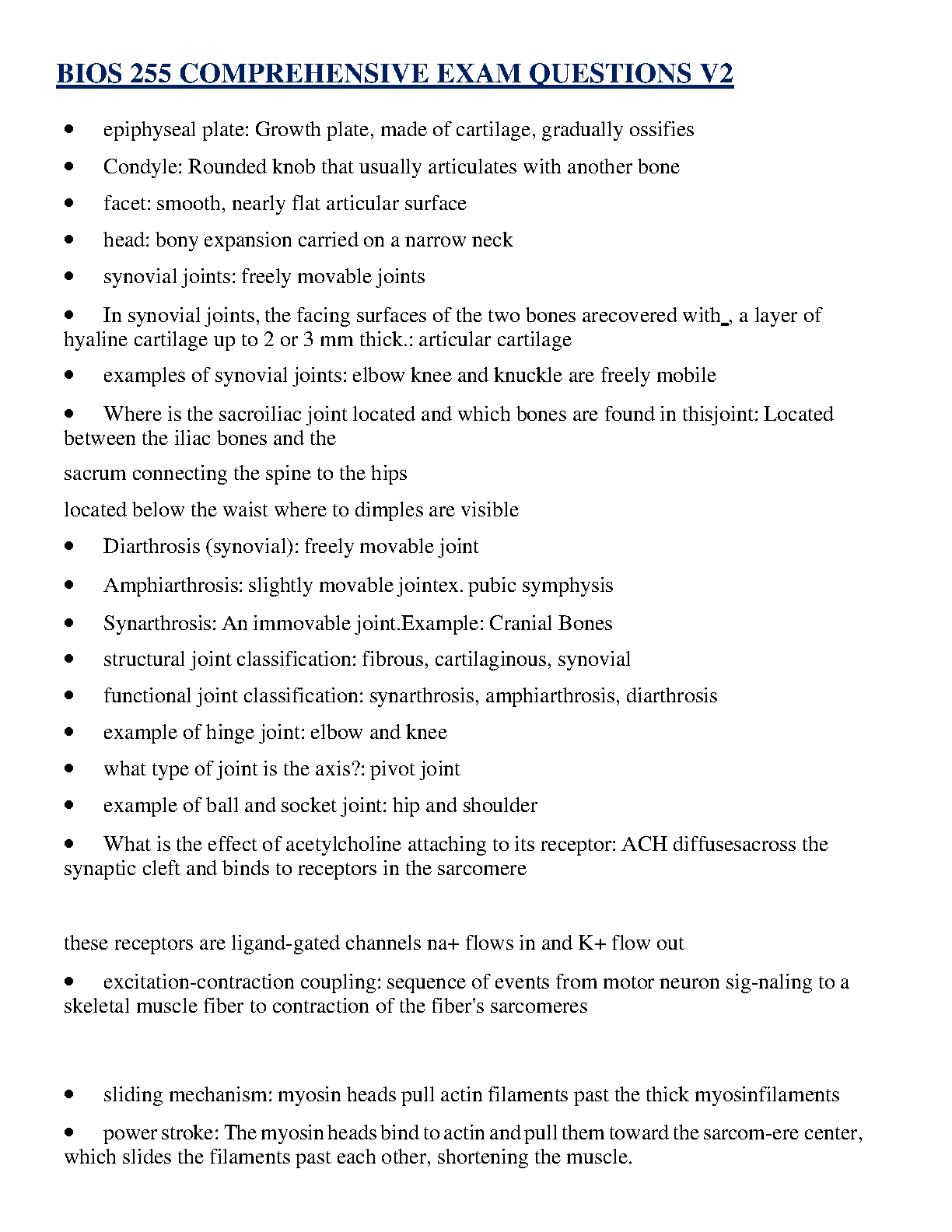 Ace your BIOS 255 Anatomy and Physiology II final with our meticulously compiled Comprehensive Exam V2 Test Bank. This essential study resource, updated for the 2025/2026 academic year, provides a complete set of questions and detailed answers to help you master key concepts and pass on your first attempt. Topics covered include detailed explorations of the skeletal system, joint classifications (synovial, fibrous, cartilaginous), functional joint types (diarthrosis, amphiarthrosis, synarthrosis), and the intricate mechanics of muscle contraction, such as the role of acetylcholine, excitation-contraction coupling, and the sliding filament model. Stop worrying about resits and gain the confidence you need to excel. Download now for immediate access to the study materials that will guide you to success in BIOS 255.