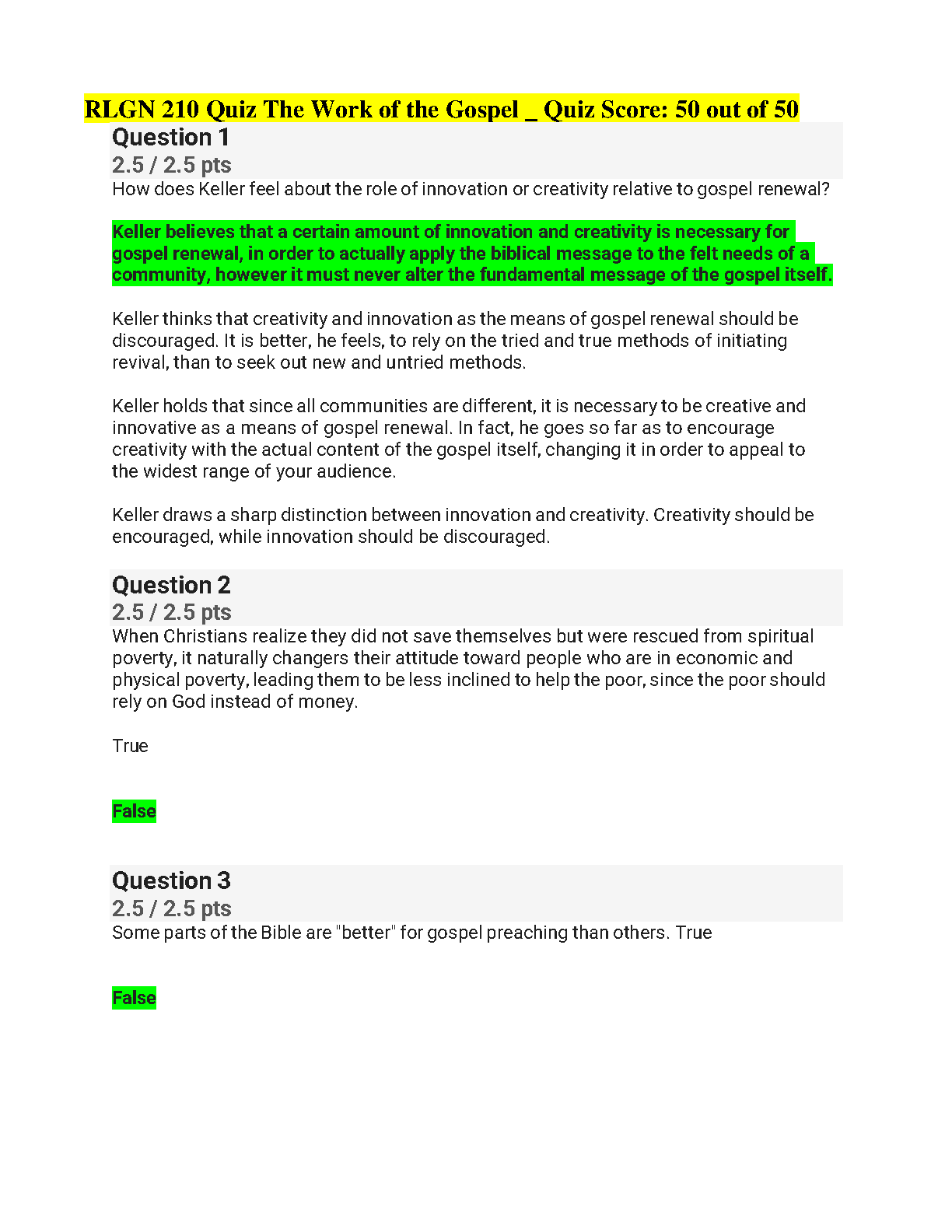 Get a perfect score on your RLGN 210 quiz! This comprehensive study resource provides the complete 'The Work of the Gospel' quiz with all questions and 100% verified correct answers. Updated for the 2025/2026 academic year, this guide is expertly designed to help you understand key concepts, including Timothy Keller's perspectives, and pass your exam with confidence on the very first try. Avoid resits and master the course material efficiently.