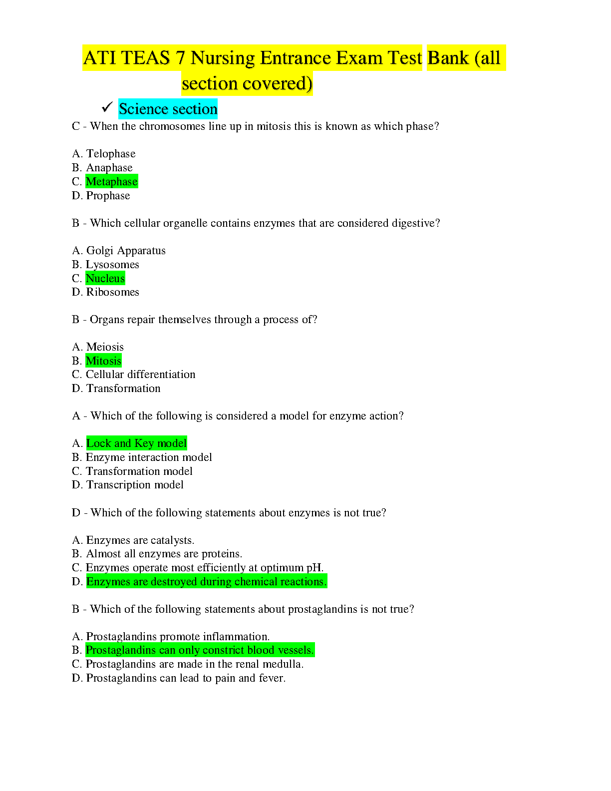 Ace the Science portion of your nursing entrance exam with our comprehensive ATI TEAS 7 Test Bank. This essential study guide, developed by the experts at Assessment Technologies Institute (ATI), provides a complete set of questions and verified answers covering all key topics in the Science section. Master concepts like cellular biology, mitosis, enzyme function, and more. This test bank is meticulously designed to help you practice, identify areas for improvement, and build the confidence needed to pass your ATI TEAS 7 exam and take the first step toward your nursing career.