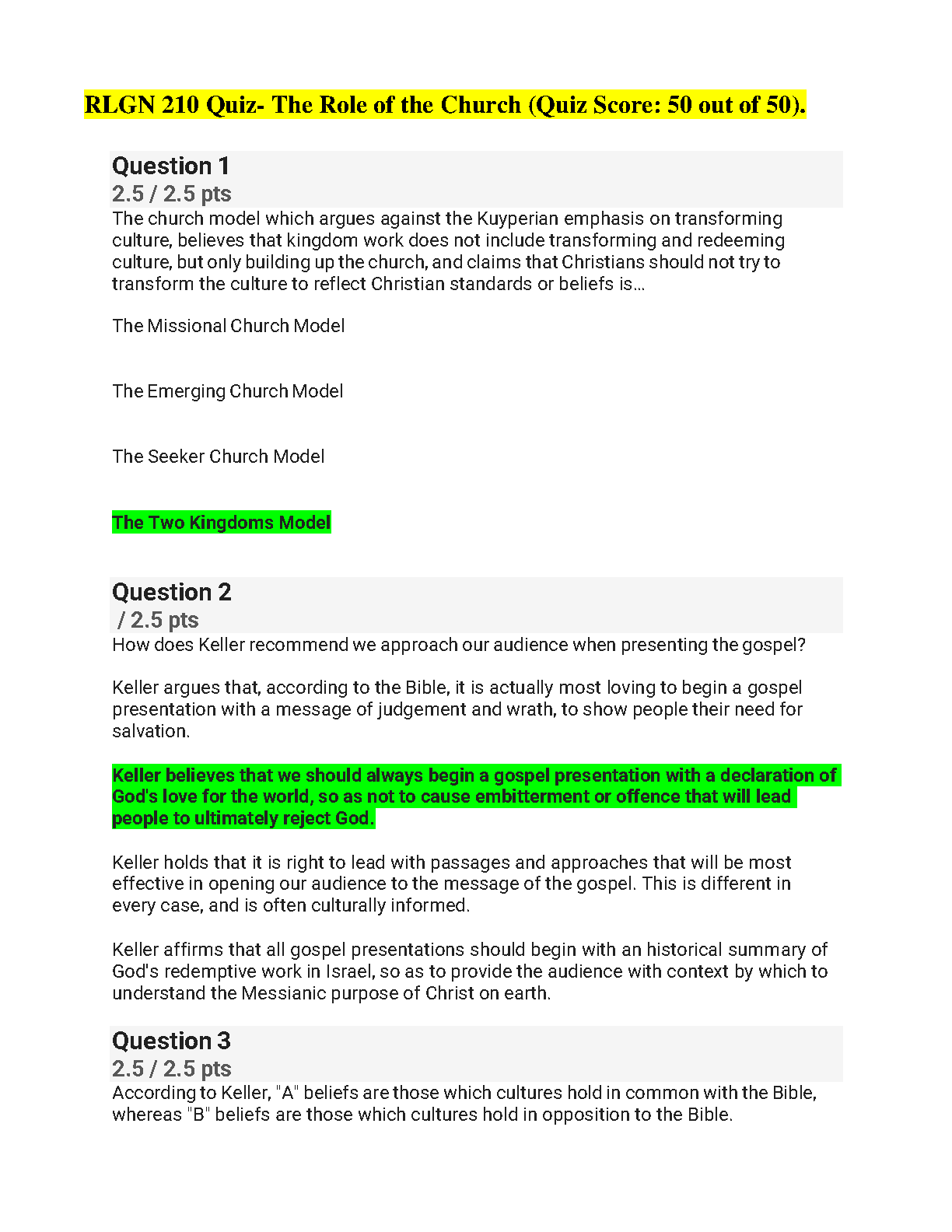 Unlock success in your RLGN 210 course with this comprehensive test bank for 'The Role of the Church' quiz. This essential study guide features all the questions from the quiz along with the verified correct answers, as demonstrated by the perfect 50/50 score. Master key concepts, including different church models and theological perspectives from thinkers like Timothy Keller, to confidently prepare for your exam and achieve a top grade.