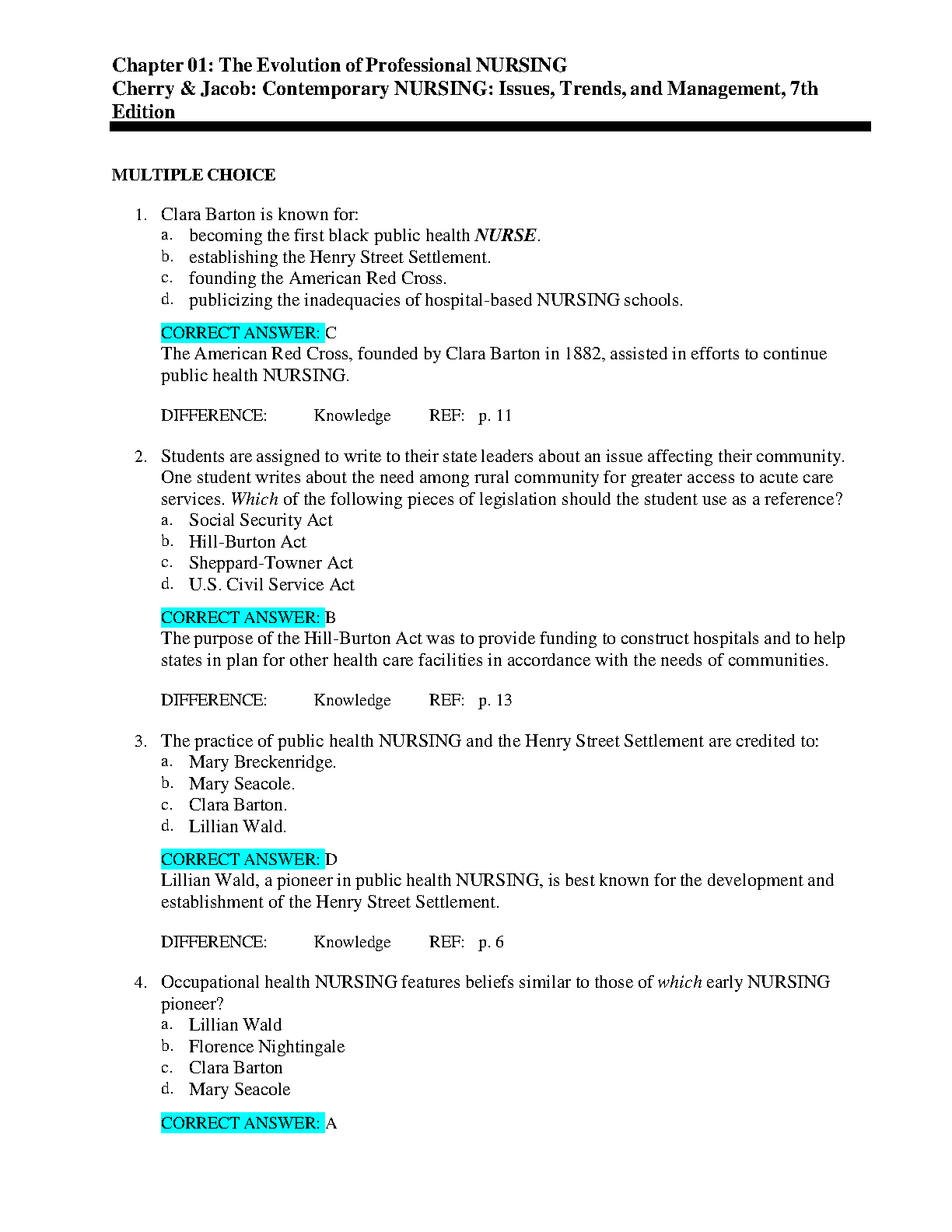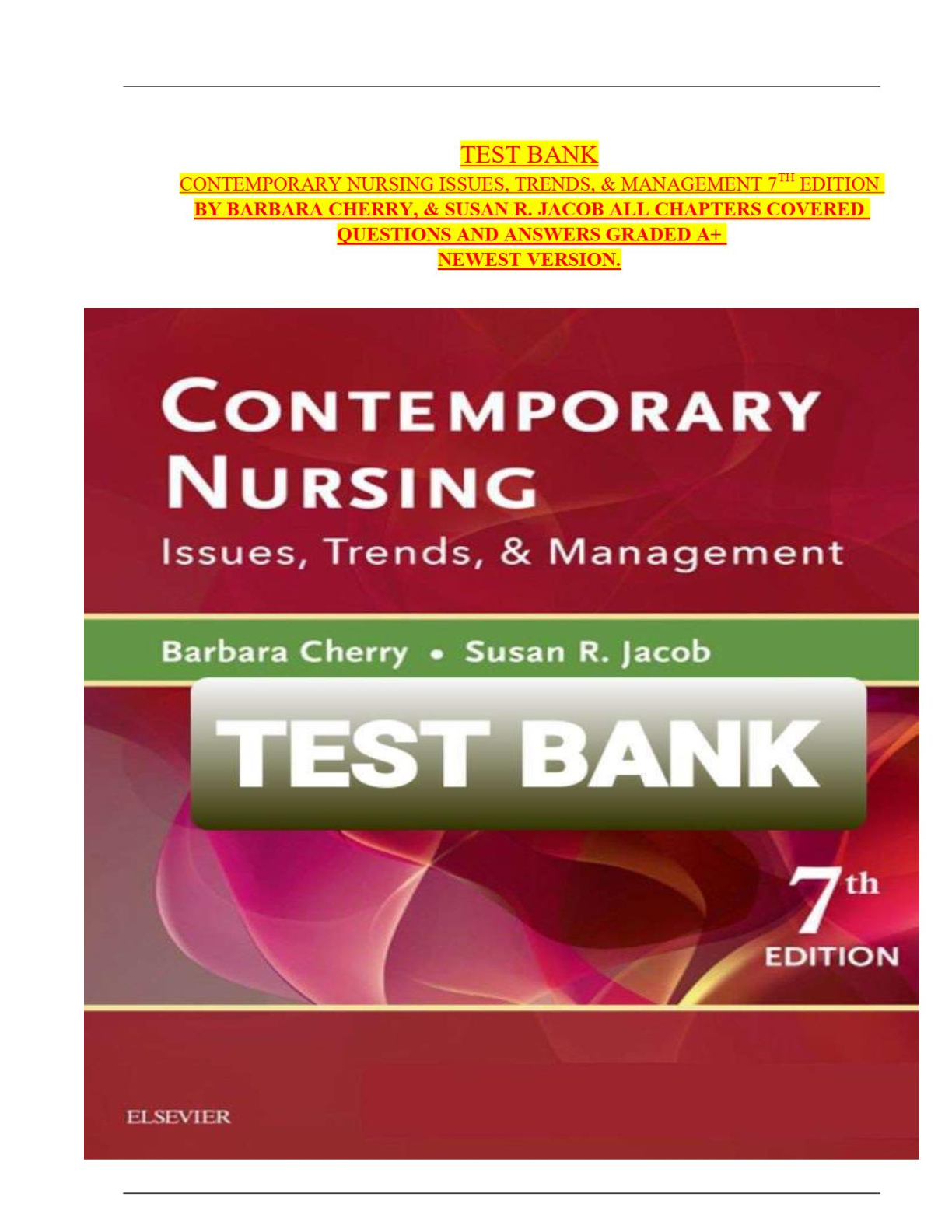 Test Bank for Contemporary Nursing: Issues, Trends, & Management, 7th Edition by Barbara Cherry and Susan R. Jacob