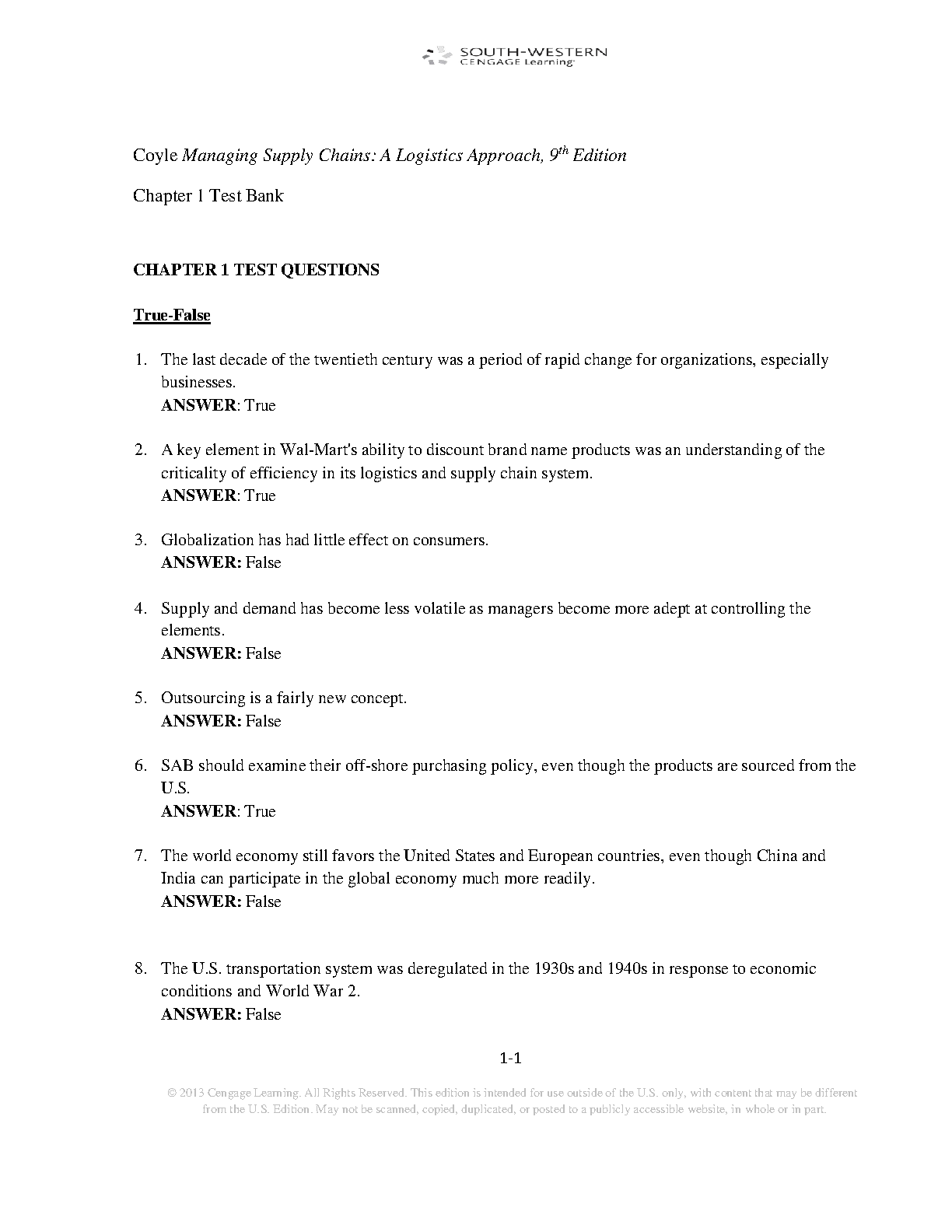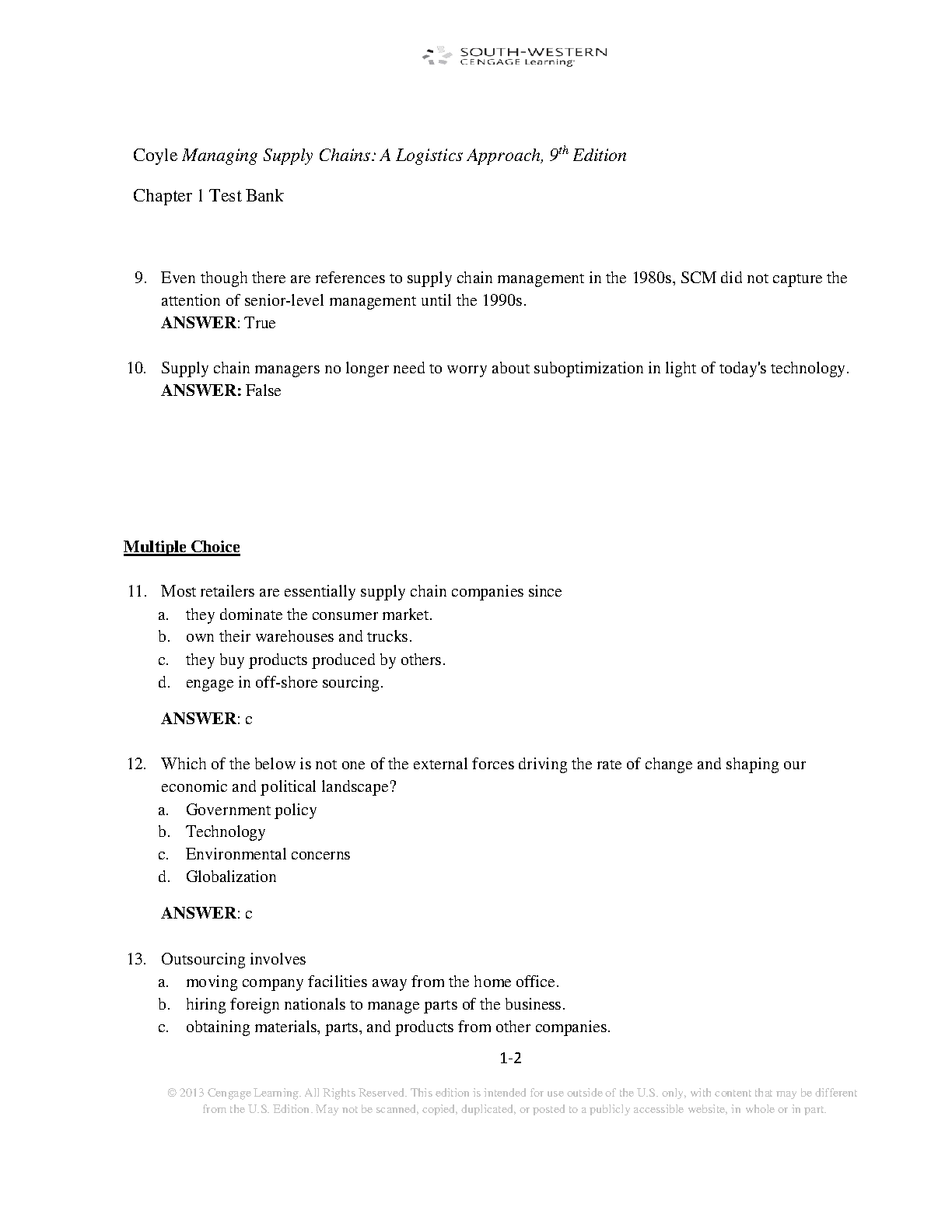 Test Bank for Managing Supply Chains: A Logistics Approach, 9th Edition by John J. Coyle, C. John Langley Jr., Robert A. Novack, Brian J. Gibson
