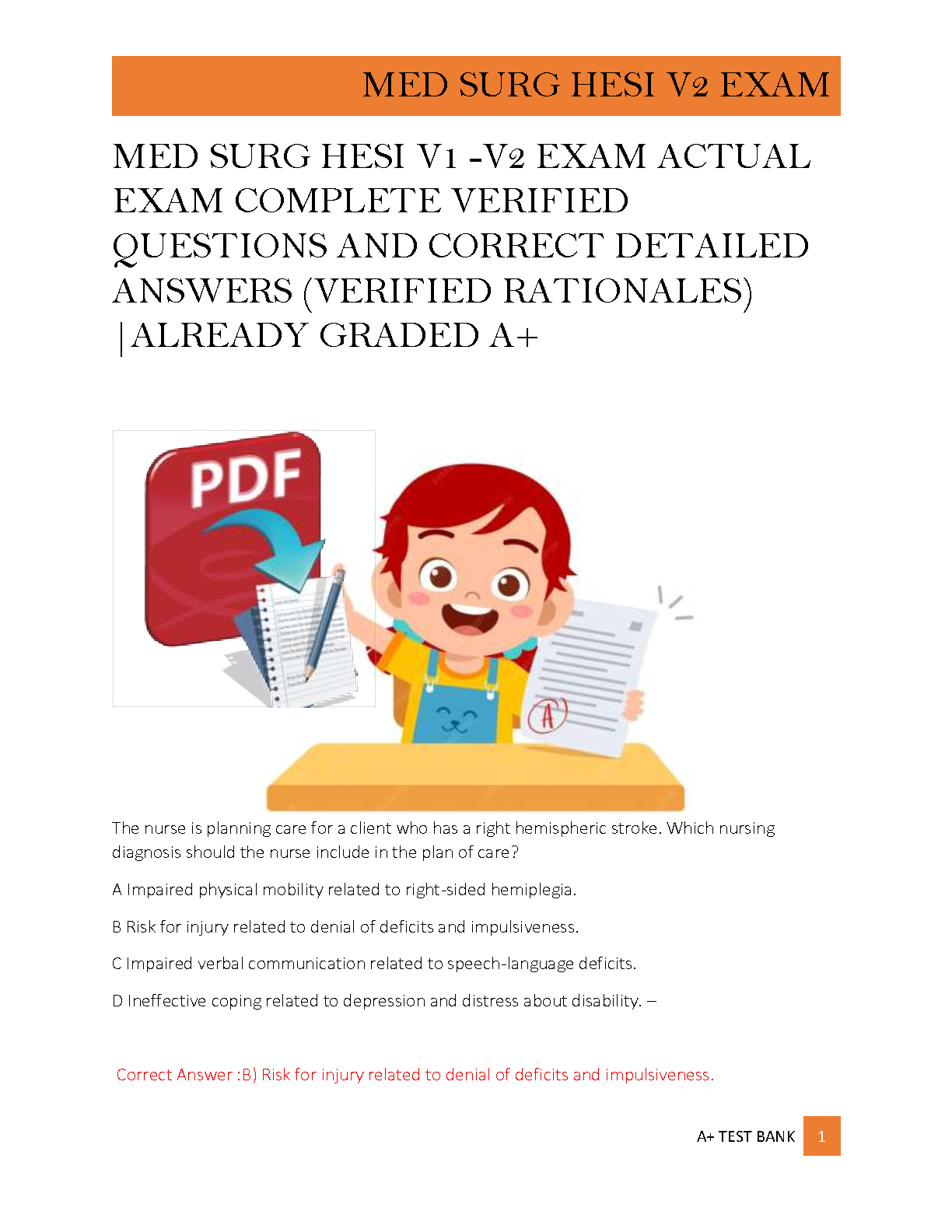 Master the Med-Surg HESI V1 and V2 exams with our comprehensive test bank, meticulously compiled for the 2024-2025 academic year. This guide is your ultimate tool for success, featuring a complete collection of actual exam questions paired with verified, detailed answers and rationales. Each question is designed to mirror the real HESI exam, helping you build confidence and identify areas for improvement. Achieve an A+ grade and pass on your first attempt with this essential study resource. Download now and start preparing to excel in your nursing career!