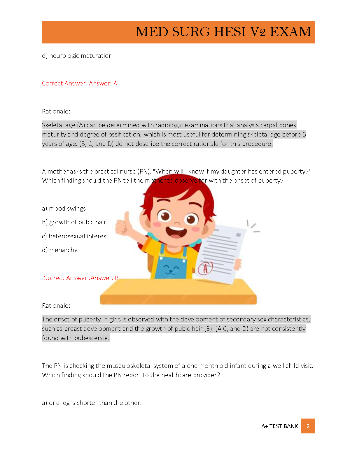 Ace your nursing exams with this comprehensive test bank for the HESI Med-Surg V2 PN Exam. This A+ graded resource is packed with a wide range of verified questions and detailed, correct answers complete with rationales. It not only covers Medical-Surgical nursing but also includes essential content from OB, Pediatrics, and the Maternity NCLEX PN Predictor Final Exam. Perfect for nursing students aiming to master key concepts, pass on the first attempt, and achieve top grades. Unlock your potential and study with confidence!
