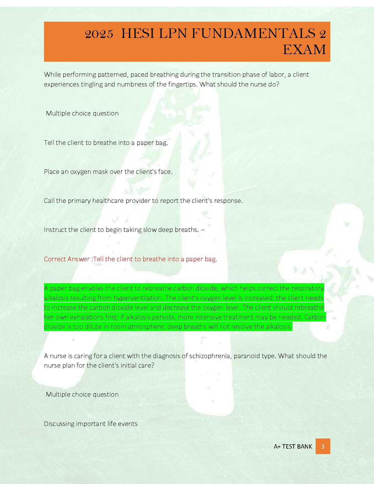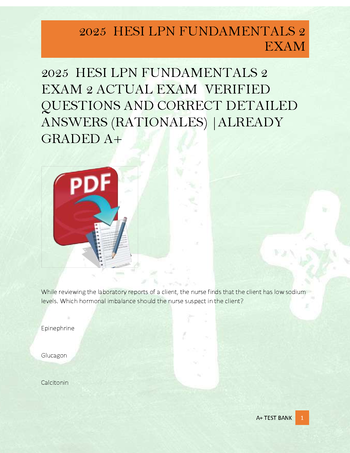 Ace your HESI LPN Fundamentals 2 Exam with our latest 2025 Test Bank. This essential study guide is packed with actual, verified exam questions and provides correct, detailed answers complete with comprehensive rationales. Designed for aspiring LPNs, this resource is your key to understanding core concepts and achieving an A+ grade. Prepare effectively, boost your confidence, and pass your exam on the first try.