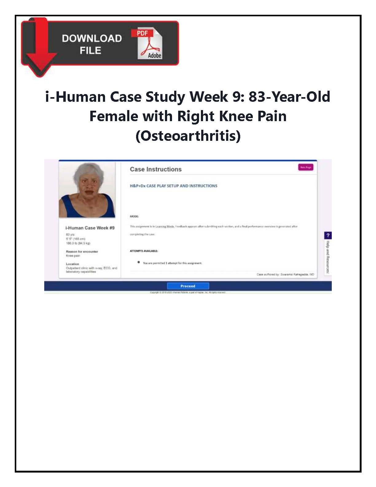 Master the Week 9 i-Human case study on Osteoarthritis, featuring an 83-year-old female patient with right knee pain. This recently updated resource for the 2025/2026 academic year provides a complete walkthrough and expert insights to help you ace your assignment and exams on the first try. Avoid resits and build your clinical reasoning skills with this essential study guide.