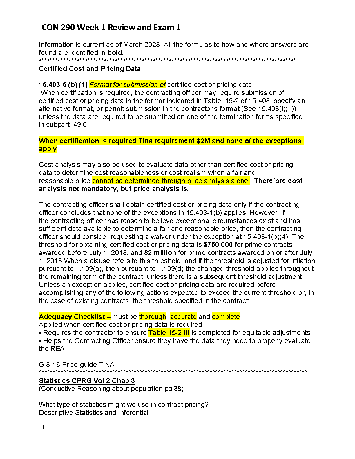 Master the fundamentals of government contracting and ace your CON 290 Week 1 Exam 1 with this comprehensive study guide, fully updated for the 2025/2026 academic year. This essential resource provides detailed elaborations on critical topics such as Certified Cost and Pricing Data, the Truth in Negotiations Act (TINA) and its $2M threshold, and key Federal Acquisition Regulation (FAR) clauses. Drawing insights from the official DoD's Contract Pricing Reference Guides (CPRG), this guide simplifies complex concepts, including the application of cost versus price analysis and the Adequacy Checklist. Designed specifically to help students pass on their first attempt and avoid resits, this is the ultimate tool for success in contract administration.