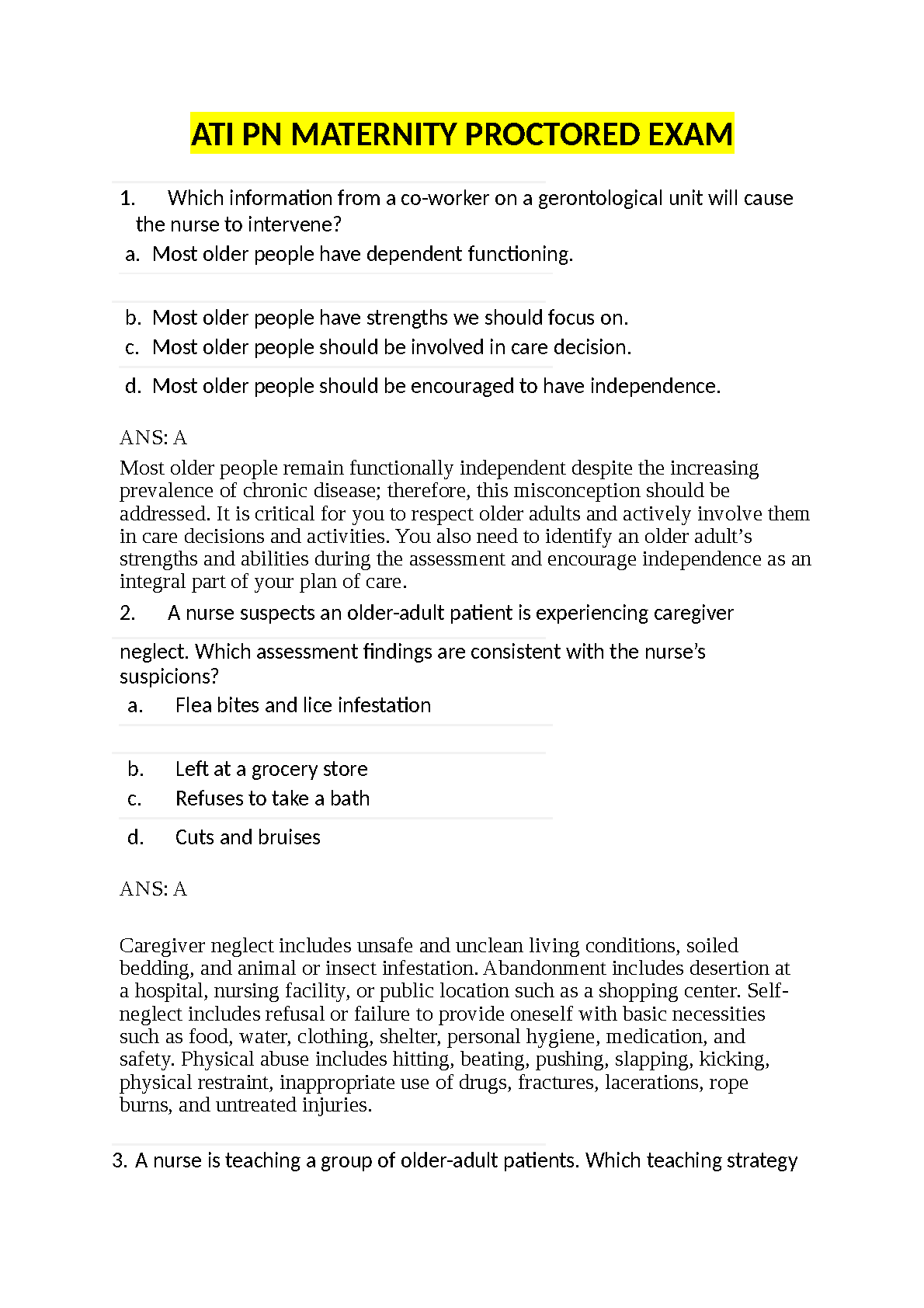 Prepare to excel in your nursing career with our latest 2025/2026 ATI PN Adult Med-Surg Proctored Exam Test Bank. This comprehensive resource focuses on key gerontology nursing concepts, providing a vast collection of practice questions complete with detailed answers and rationales. Each question is designed to mirror the actual proctored exam, helping you build confidence, master critical topics like elder care and caregiver neglect, and ensure you pass on your first attempt. Stop worrying about resits and start studying smarter with this essential guide for all practical nursing students.
