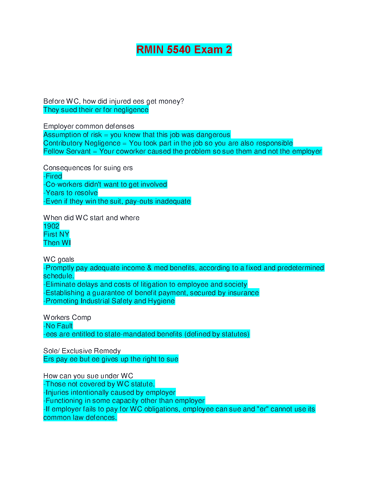 Get ready to master your RMIN 5540 Exam 2 with this ultimate study guide, freshly updated for the 2025/2026 academic year. This resource offers in-depth elaborations on crucial topics in Commercial Property & Liability Insurance, with a special focus on the Workers' Compensation system. Delve into the history of employee injury claims, understand key concepts like employer defenses, 'no-fault' provisions, and the 'exclusive remedy' doctrine. These meticulously organized notes are your key to understanding complex material efficiently, ensuring you pass the exam on your first attempt and avoid costly resits.