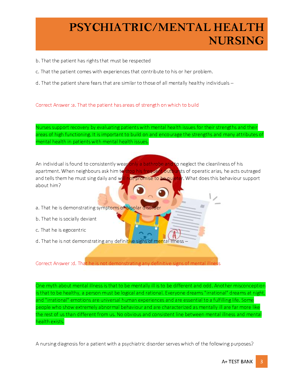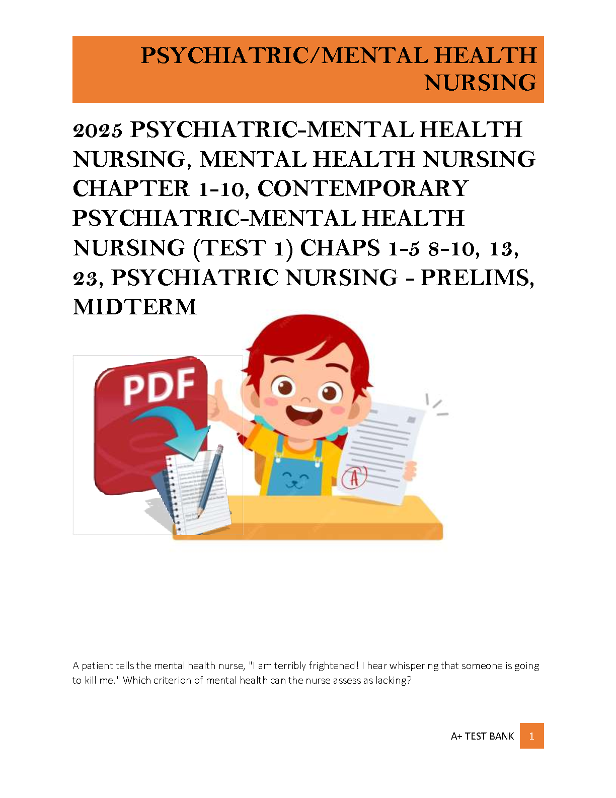 Master your Psychiatric-Mental Health Nursing course with the official Test Bank for 'Contemporary Psychiatric-Mental Health Nursing, 4th Edition' by Carol A. Kneisl and Eileen Trigoboff. This comprehensive resource, fully updated for the 2025-2026 academic year, is your ultimate tool for acing prelims and midterms. It provides an extensive collection of exam-style questions and verified answers covering Chapters 1-10, 13, and 23. Stop struggling and start succeeding! This test bank is expertly designed to help you grasp complex concepts, prepare effectively, and pass your exams with confidence on the very first attempt, eliminating the need for resits. Get your A+ today!