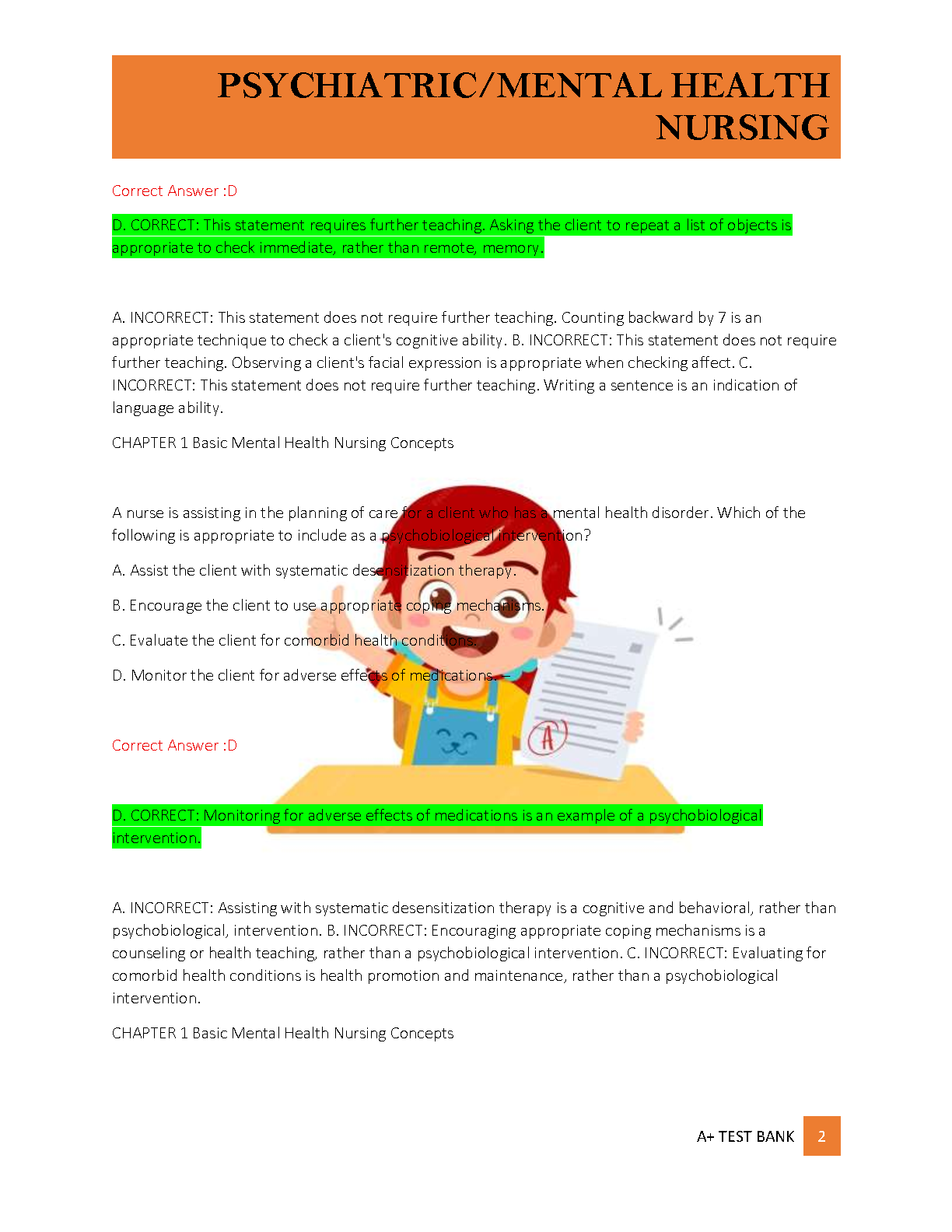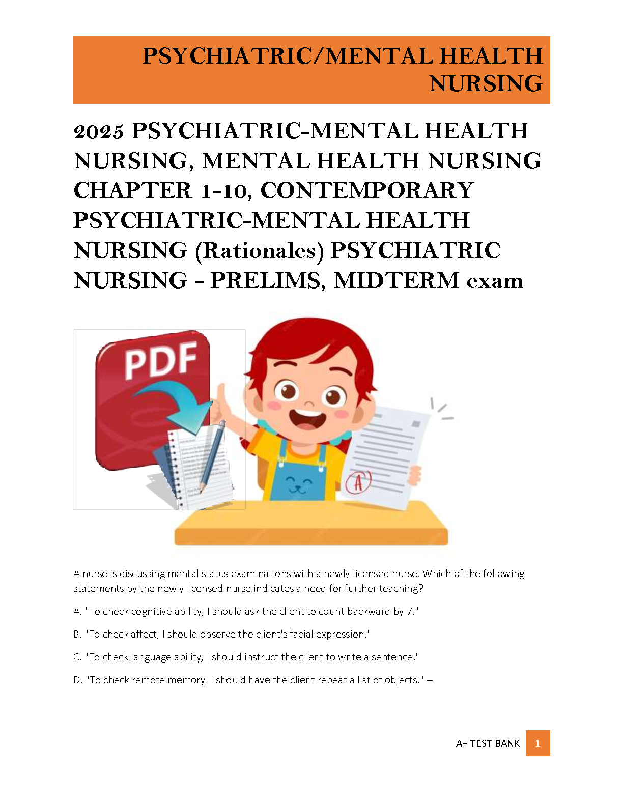Achieve top grades in your psychiatric nursing course with this complete test bank for 'Contemporary Psychiatric-Mental Health Nursing, 4th Edition' by Kneisl and Trigoboff. This resource covers chapters 1-10 and is packed with practice questions, answers, and detailed rationales perfect for preparing for your prelims and midterm exams. Master key concepts and confidently tackle your assessments with this essential study aid.