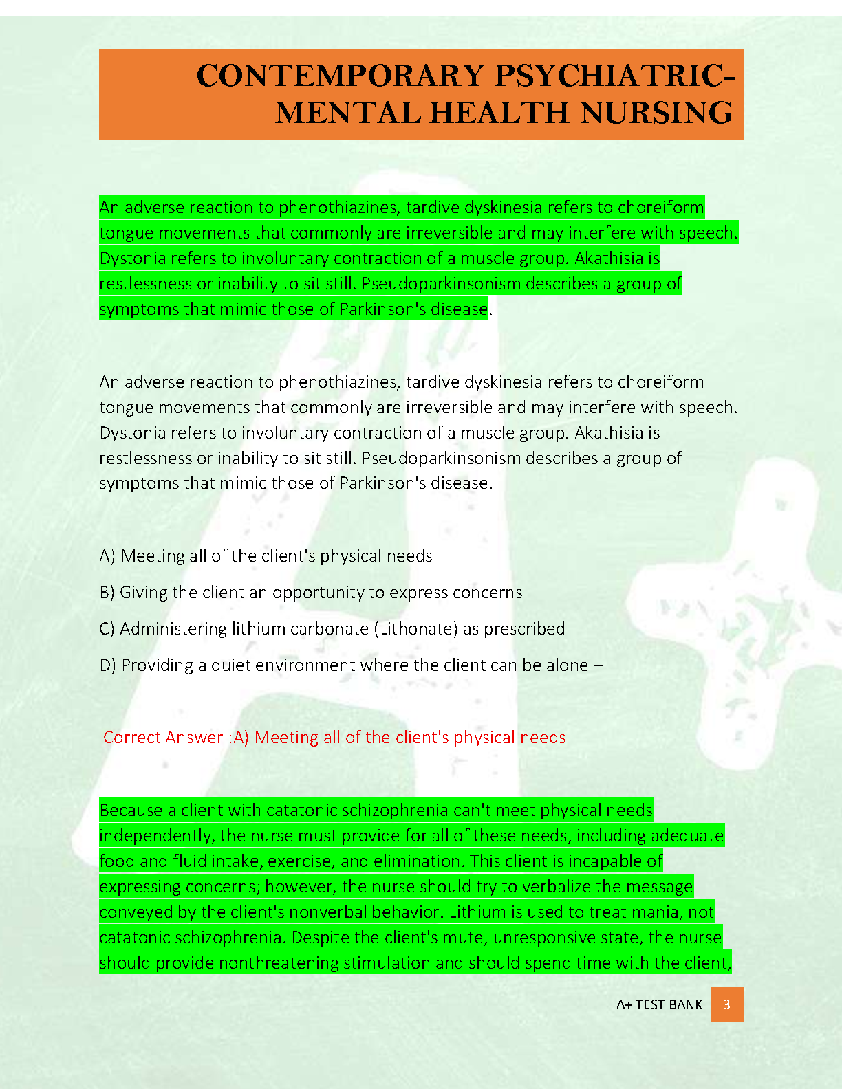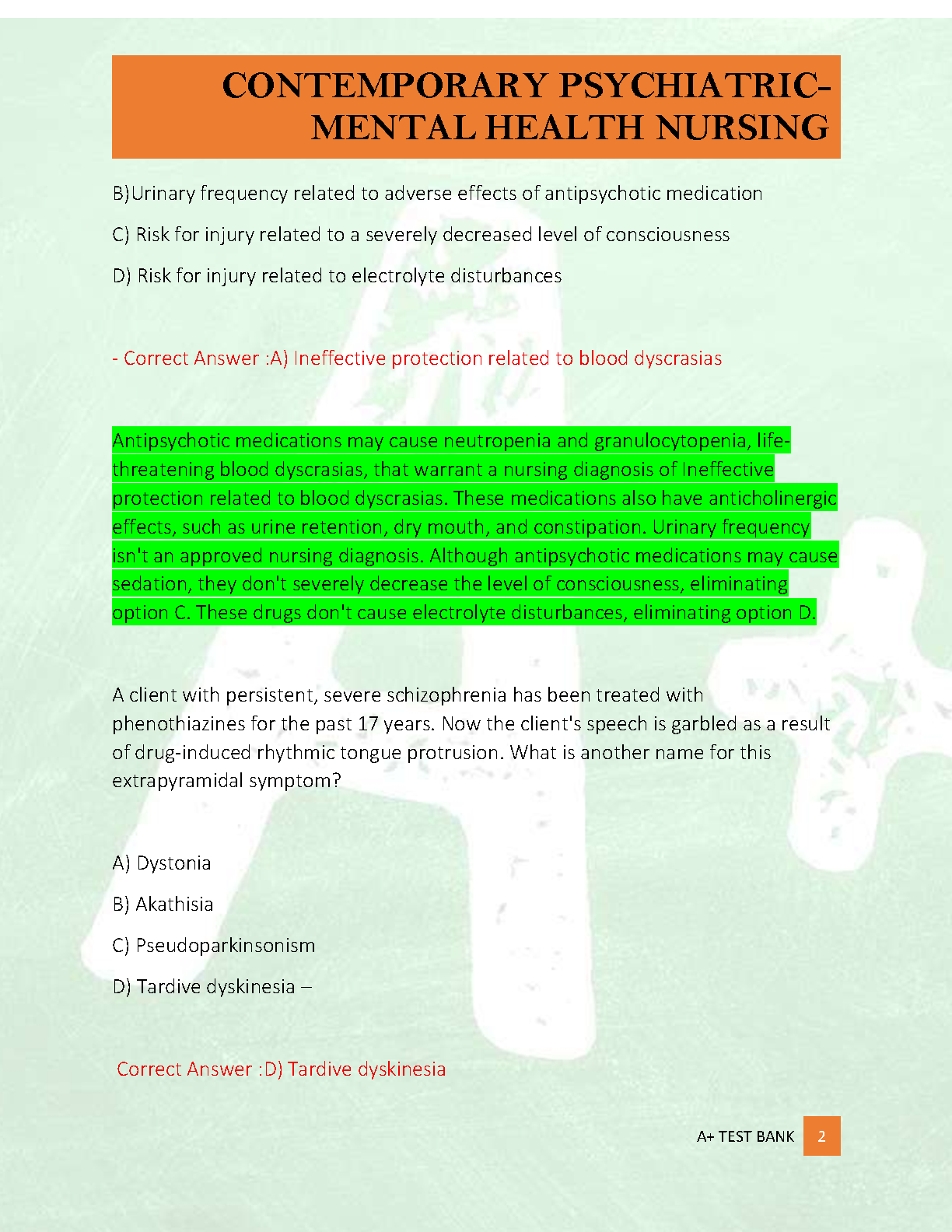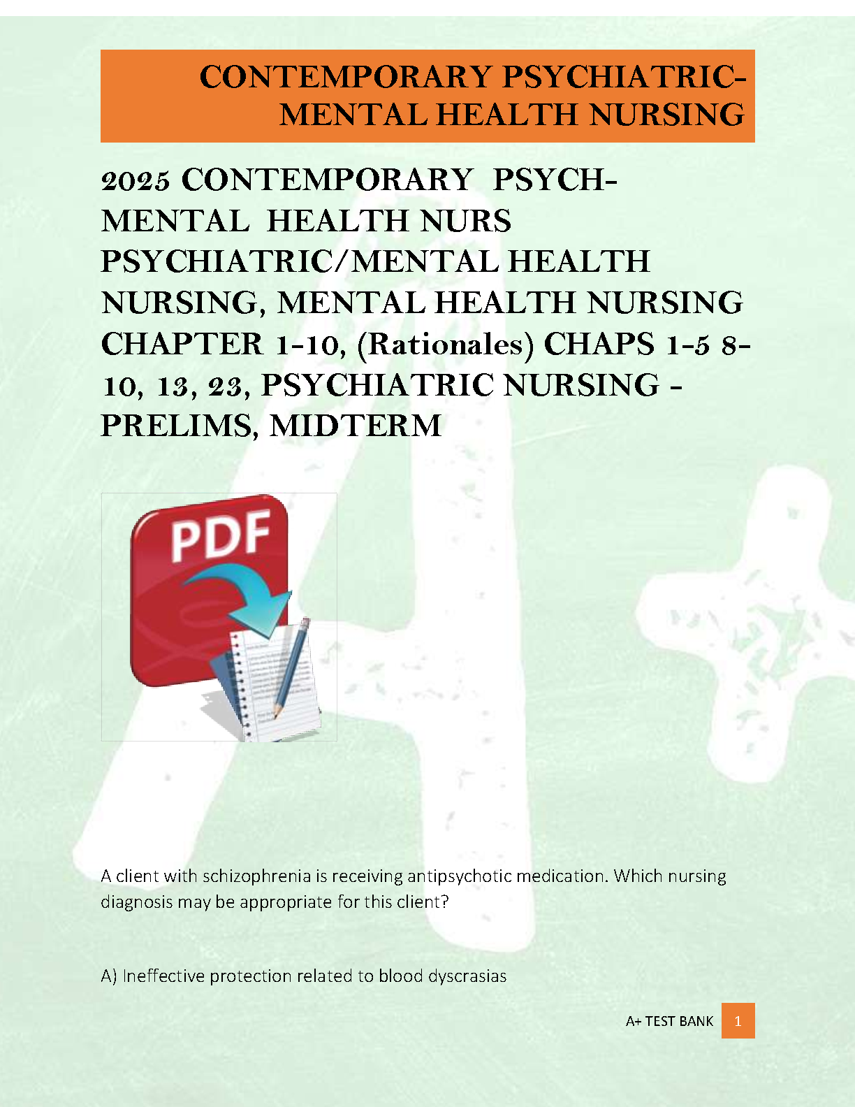 Ace your psychiatric and mental health nursing exams with the comprehensive 2025 Test Bank for 'Contemporary Psychiatric-Mental Health Nursing' by Kneisl, Breslin, and Rebar. This essential study resource provides a vast collection of multiple-choice questions (MCQs) covering key chapters, including 1-10, 13, and 23, specifically tailored for your prelims and midterm exams. Each question is accompanied by a detailed rationale, explaining not just the correct answer but also why other options are incorrect. This approach deepens your understanding and builds critical thinking skills. Prepare effectively, boost your confidence, and master the core concepts of psychiatric nursing to excel in your course. Instant PDF download available.