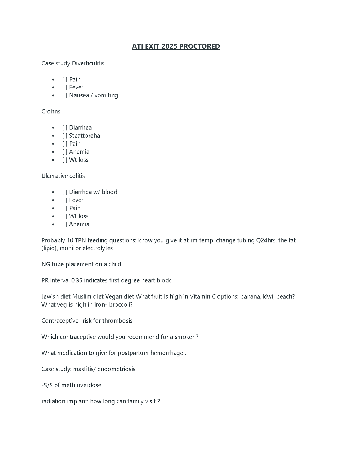 Unlock your full potential and conquer the ATI Exit Proctored Exam with our newly released 2025/2026 study guide. This essential resource is meticulously crafted to help you pass on your first attempt, eliminating the need for stressful resits. Our guide provides in-depth coverage of high-yield topics, including detailed case studies on Diverticulitis, Crohns, and Ulcerative Colitis. You'll also master critical nursing knowledge such as TPN feeding protocols, NG tube placement, interpreting cardiac rhythms like first-degree heart block, postpartum hemorrhage management, and patient safety for radiation implants. Prepare with confidence and step into your nursing career by acing the exam that matters most.