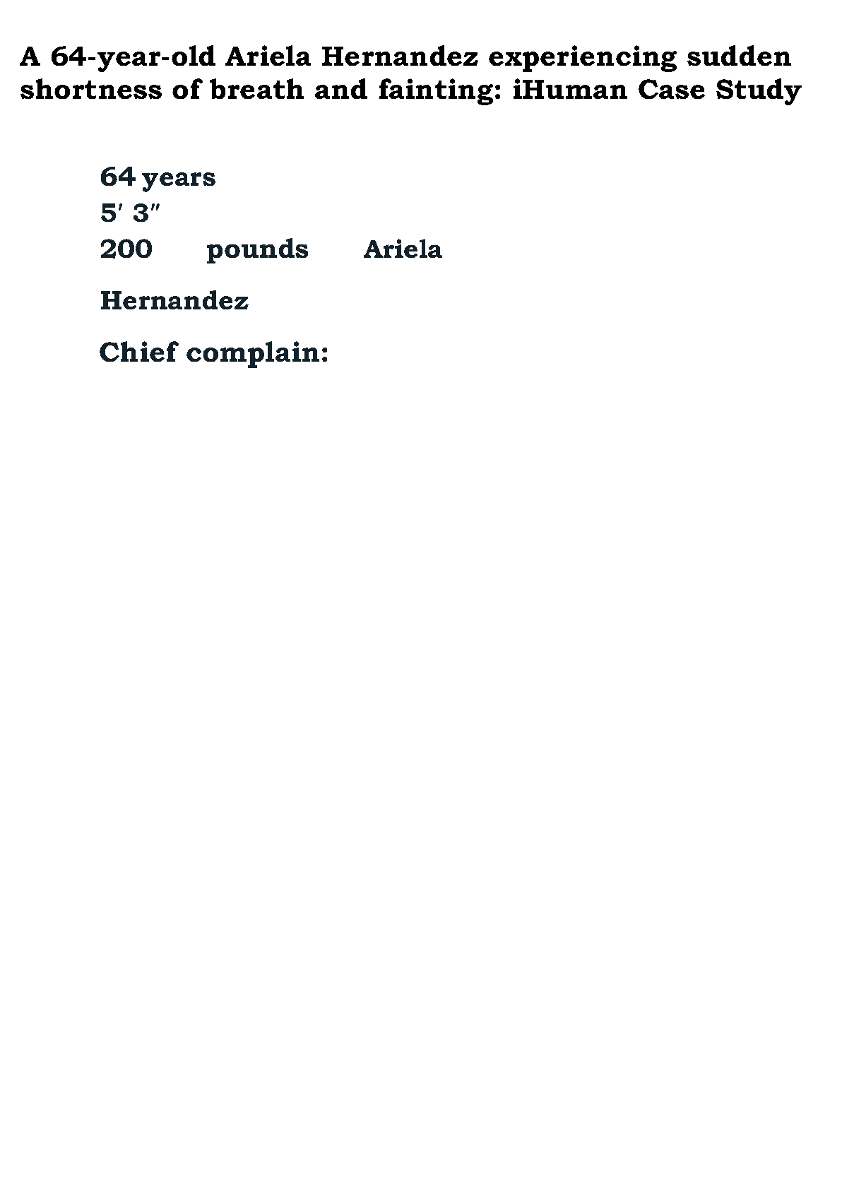 Struggling with the Ariela Hernandez case study on the iHuman platform? Get the ultimate advantage with our latest 2025/2026 study guide. This resource provides a complete, step-by-step walkthrough for the case of a 64-year-old female presenting with sudden shortness of breath and fainting. Unlock detailed answers, expert rationale, and key diagnostic insights to master this challenging simulation. This guide is specifically designed to help you excel in your nursing coursework and pass your exams with confidence on the very first try, avoiding costly resits. Download now and secure your A+ grade!
