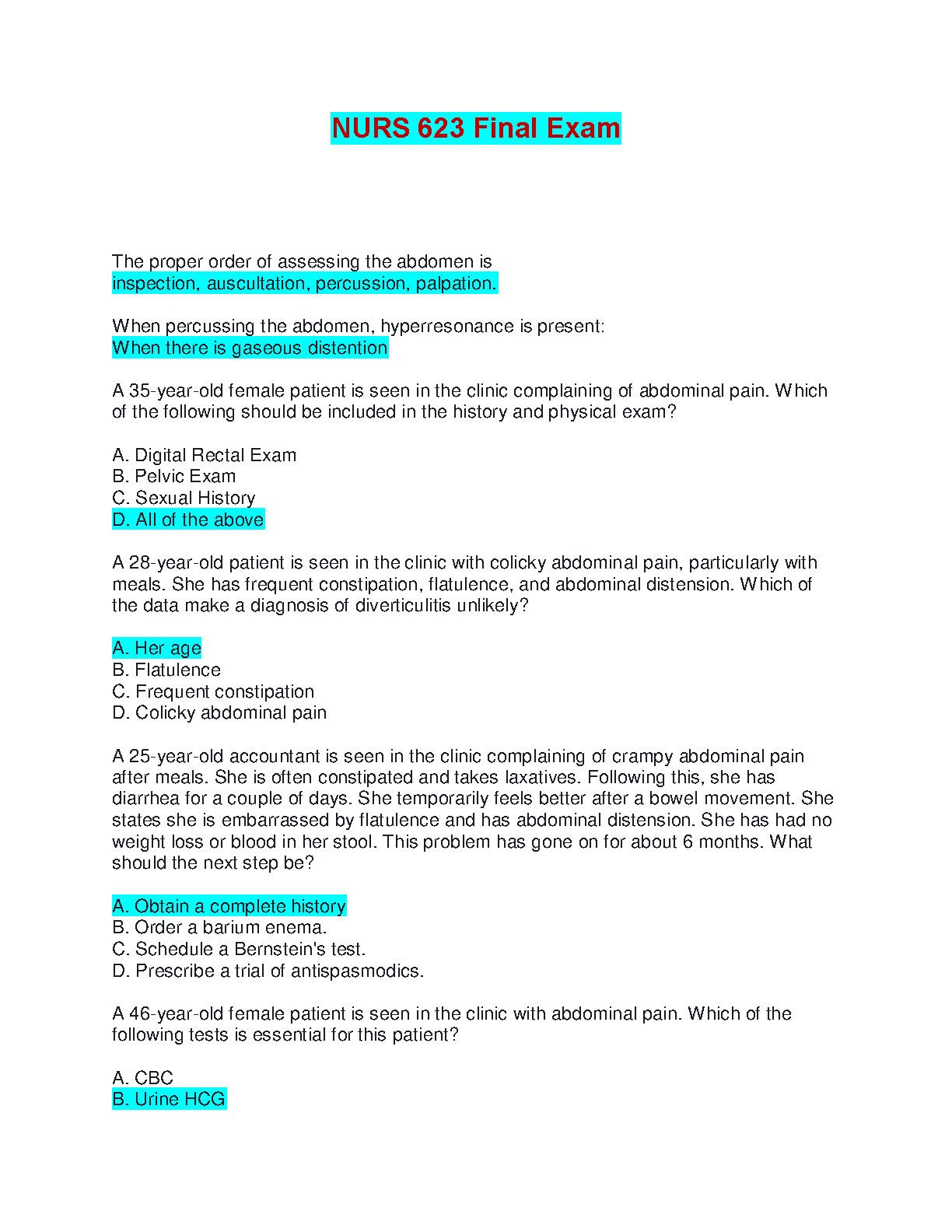 Master the NURS 623 Final Exam with our comprehensive test bank, specifically designed for the 2025/2026 academic year. This essential study aid features a verified collection of questions and correct answers, covering crucial topics like advanced patient assessment, abdominal examination, and differential diagnosis. Prepare effectively, understand key concepts, and walk into your exam with the confidence to pass on your first try. Download this guide to stop guessing and start acing your nursing finals!