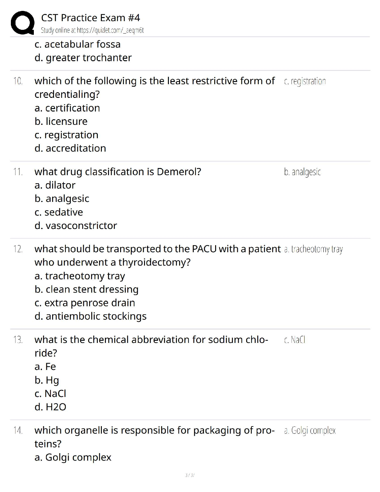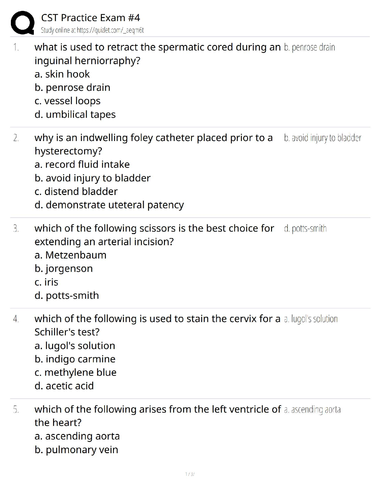 Prepare to excel on your Certified Surgical Technologist (CST) certification exam with our comprehensive Test Bank for Practice Exam 4. This essential study resource is packed with a wide range of multiple-choice questions and detailed answers, mirroring the format and difficulty of the actual CST exam. Covering critical topics such as surgical instruments, procedural knowledge, and patient care, this test bank is expertly designed to reinforce your learning and boost your confidence. Master the material, identify your strengths and weaknesses, and walk into your exam fully prepared to pass on your first attempt. Secure your future as a CST with this indispensable study guide.