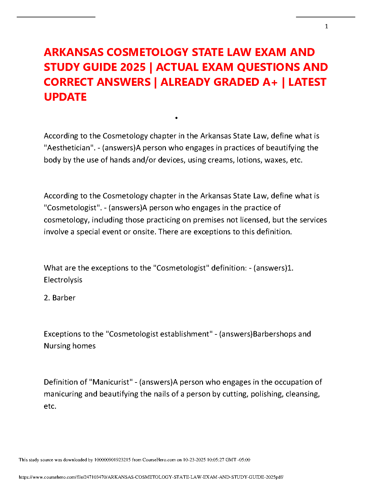 Arkansas Cosmetology State Law Exam Test Bank 2025: Comprehensive Q&A with 100% Correct, A+ Graded Answers